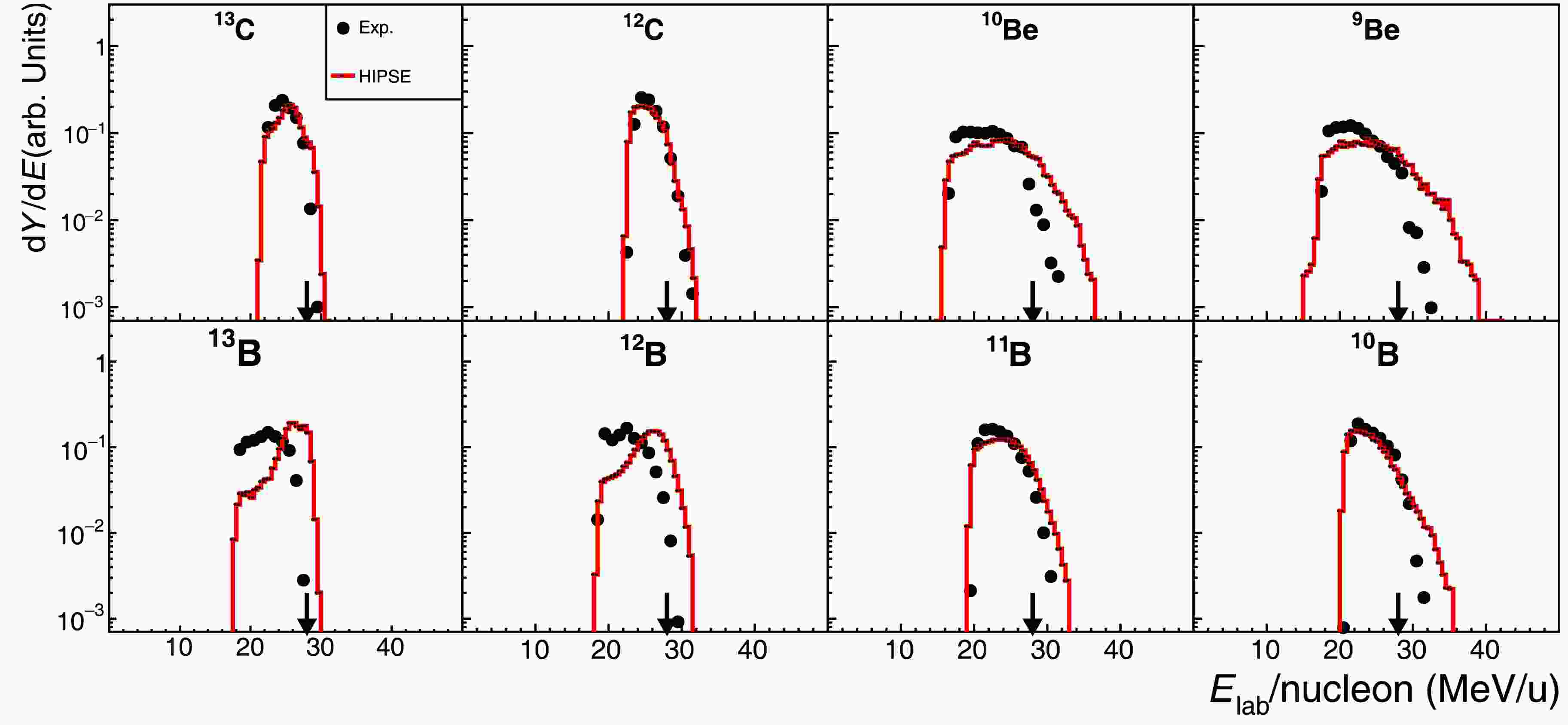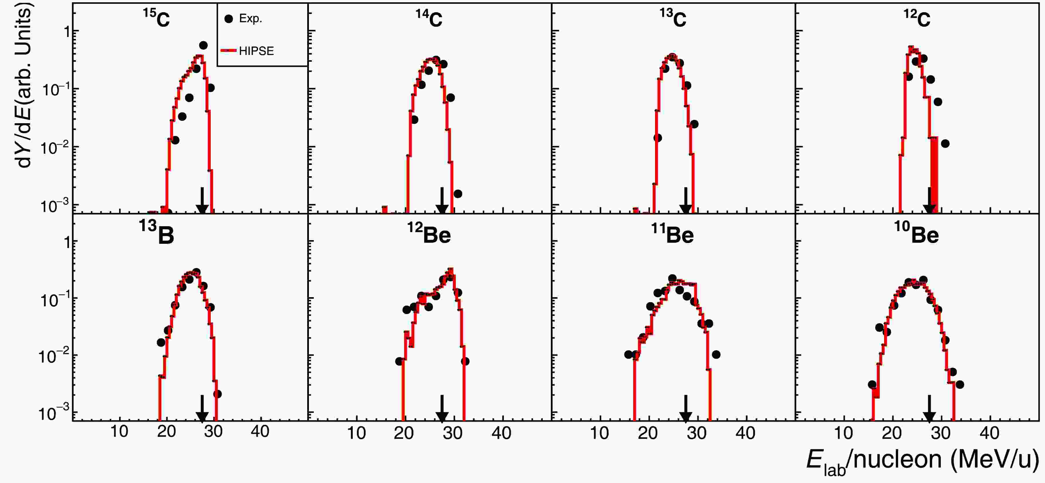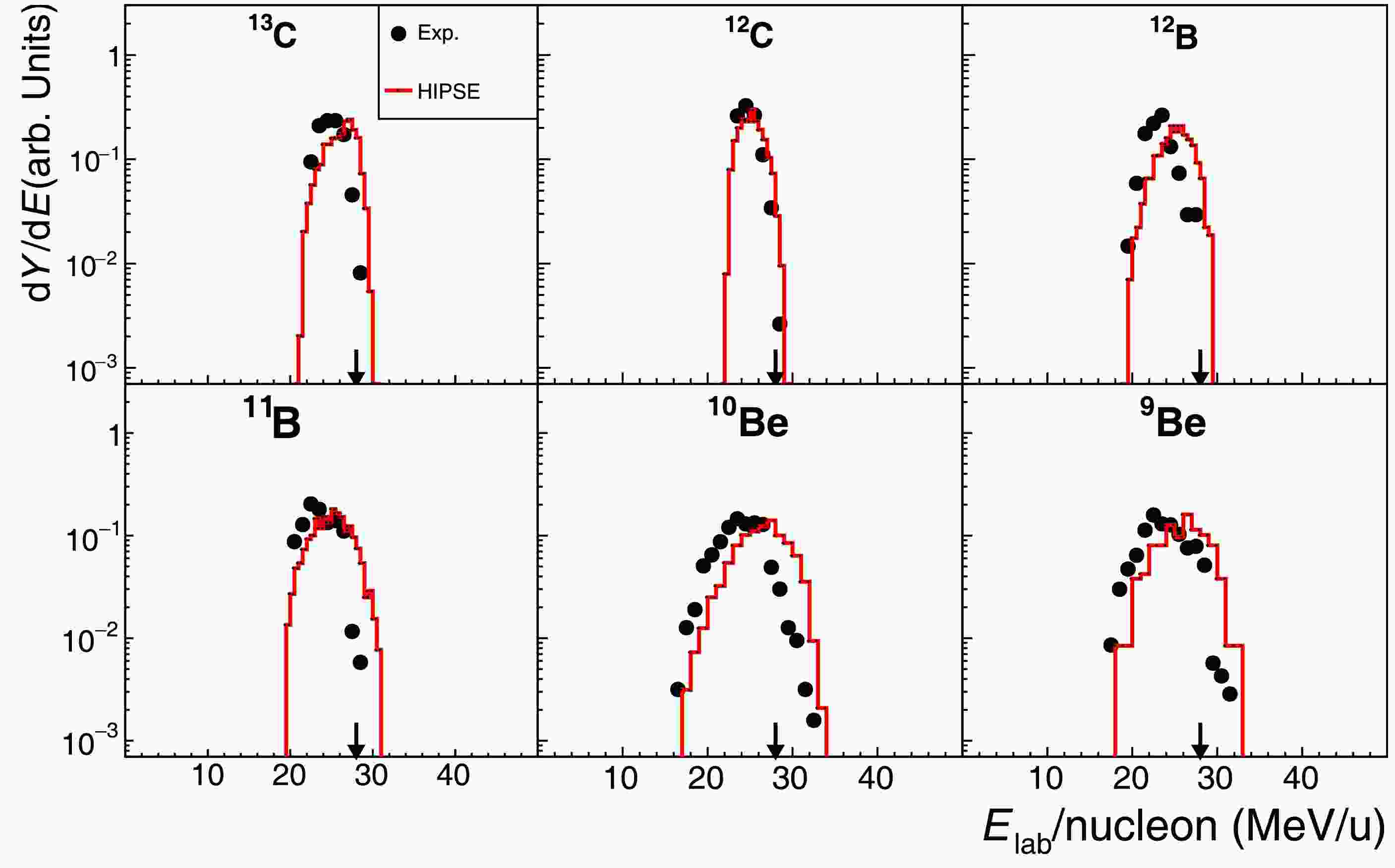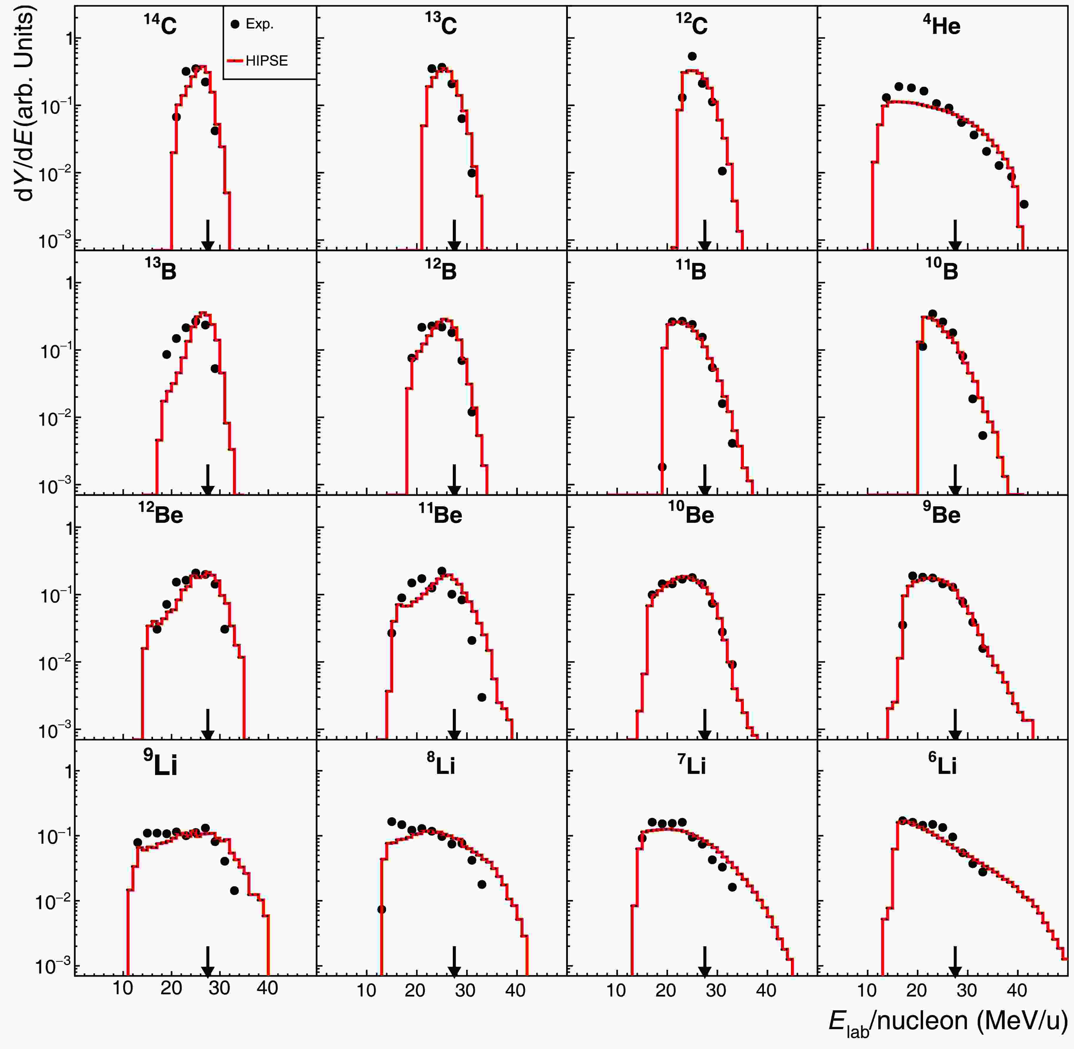 Figure 3. (color online) Experimental Energy spectra (black-solid points) in comparison to the corresponding HIPSE-SIMON model calculations (red-solid lines) for fragments produced in the reaction 16C + C at 27.5 MeV/nucleon [30, 33]. Each spectrum is normalized to its integral for a better shape comparison. The arrow in each panel indicates the incident beam energy per nucleon (“
