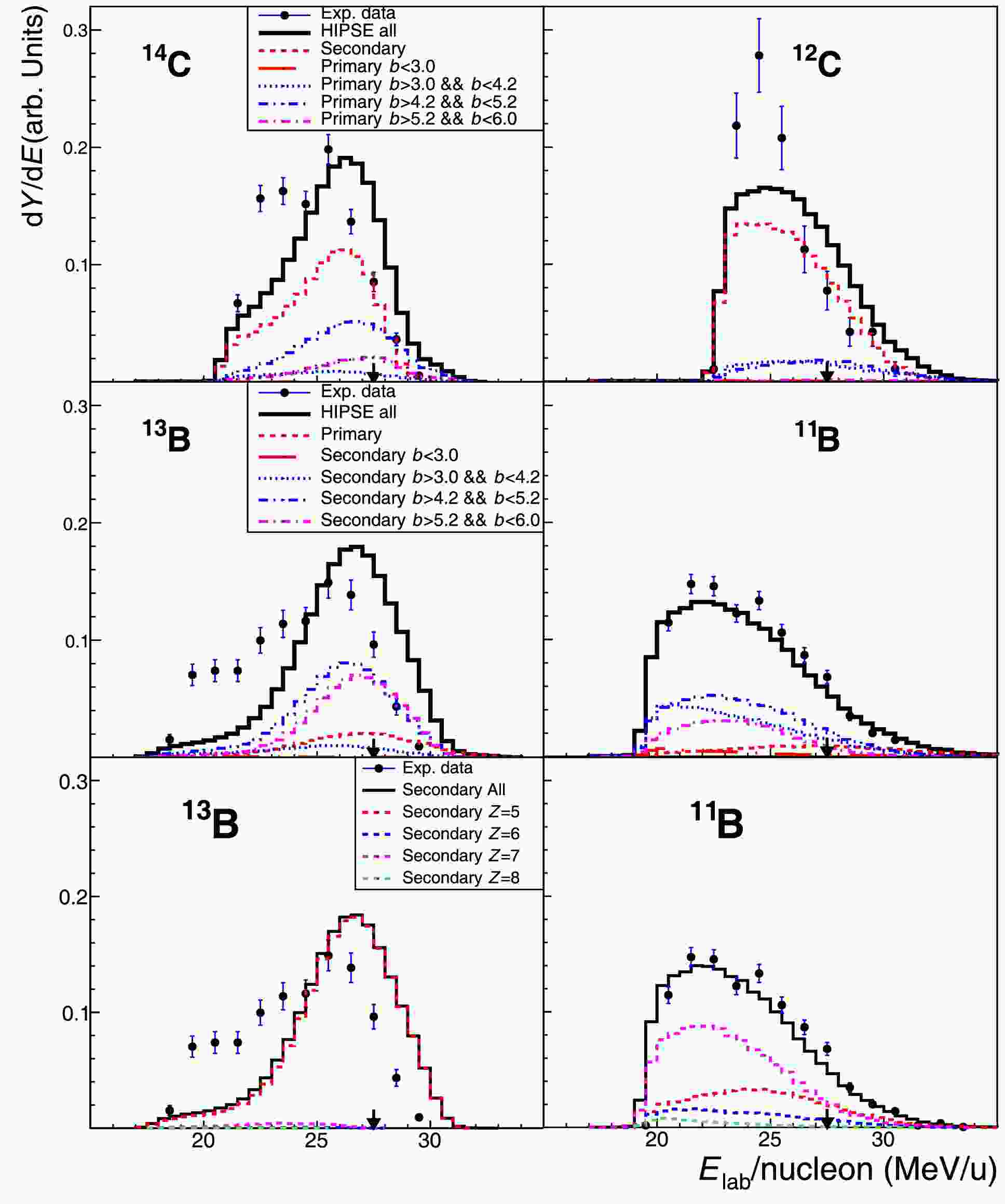 Figure 8. (color online) Fragment-energy spectra for selected isotopes produced in 16C + C reaction. In each panel the calculated spectra are normalized to the integral of the “all” spectrum while data points are presented relative the data integral (Error bars are statistical only) [30, 33]. Top panels for 14C and 12C isotopes: Experimental data in comparison to HIPSE-SIMON model calculations characterized by primary reaction processes within different impact parameter (b, in unit of fm) zones having the equal zone-area; Middle panels for 13B and 11B: The comparisons characterized by secondary decay processes within different impact parameter zones; Bottom panels for 13B and 11B: Calculated secondary decay processes characterized by mother nuclei which decay to the actual final fragment. Panels in the same row share the same label inset.