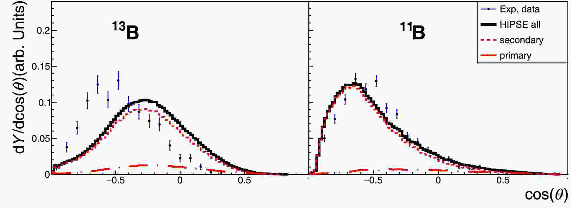 Figure 9. (color online) Angular distributions of fragments 13B and 11B produced in 16C + C reaction (refer to Fig. 8 for the normalized presentation). θ is the azimuthal angle of the fragment defined in the beam-particle system and with the zero-degree axis pointing to the beam direction. Note that experimental or calculated fragments are filtered by the detection system. Error bars are statistical only. Panels in the same row share the same label inset.