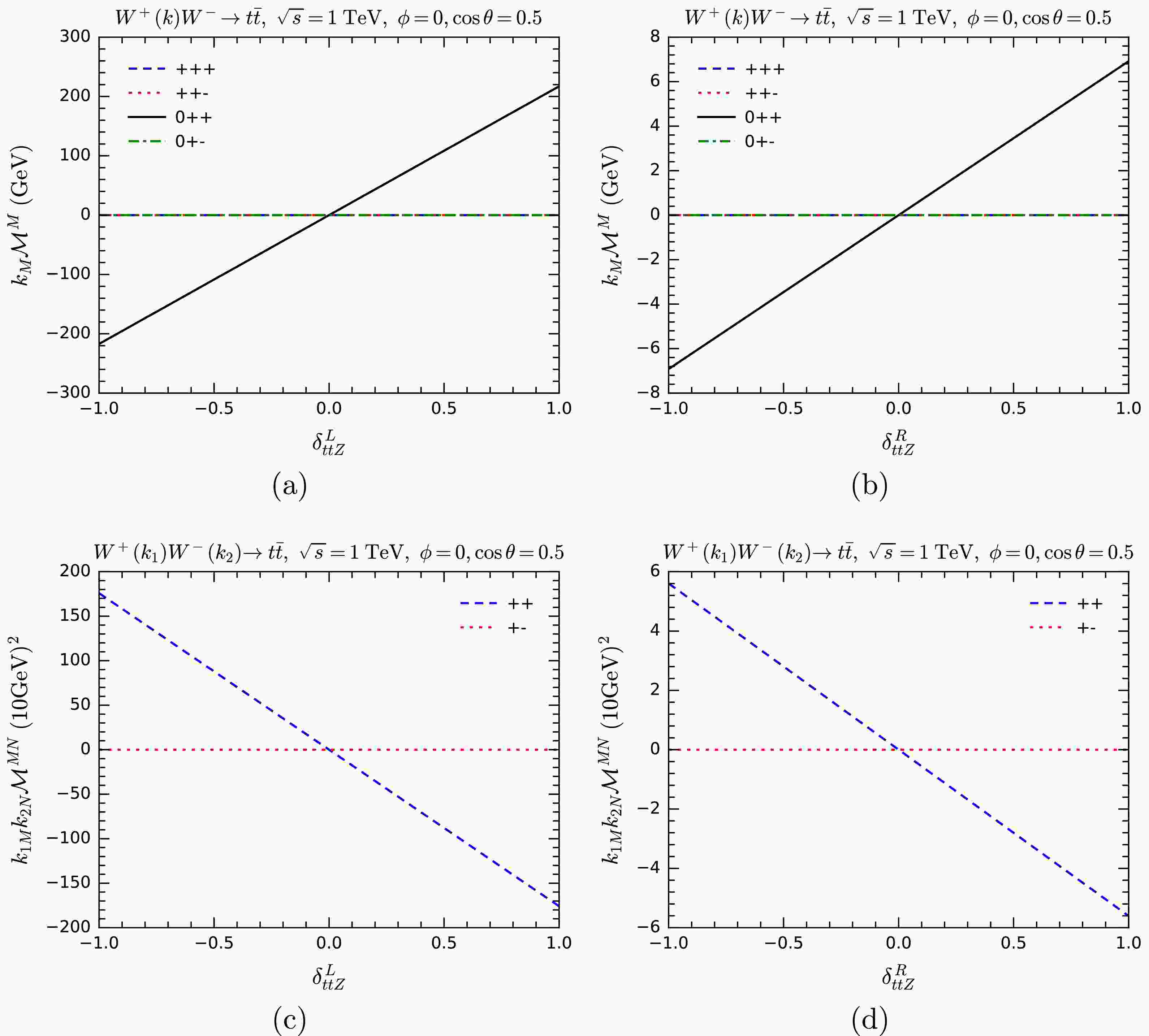 $ WW\rightarrow t\bar t $ , we separately modify the couplings of the$ tbW $ ,$ ttZ $ , and$ tth $ vertices. The results are shown in Fig. 15.Figure 15. (color online)