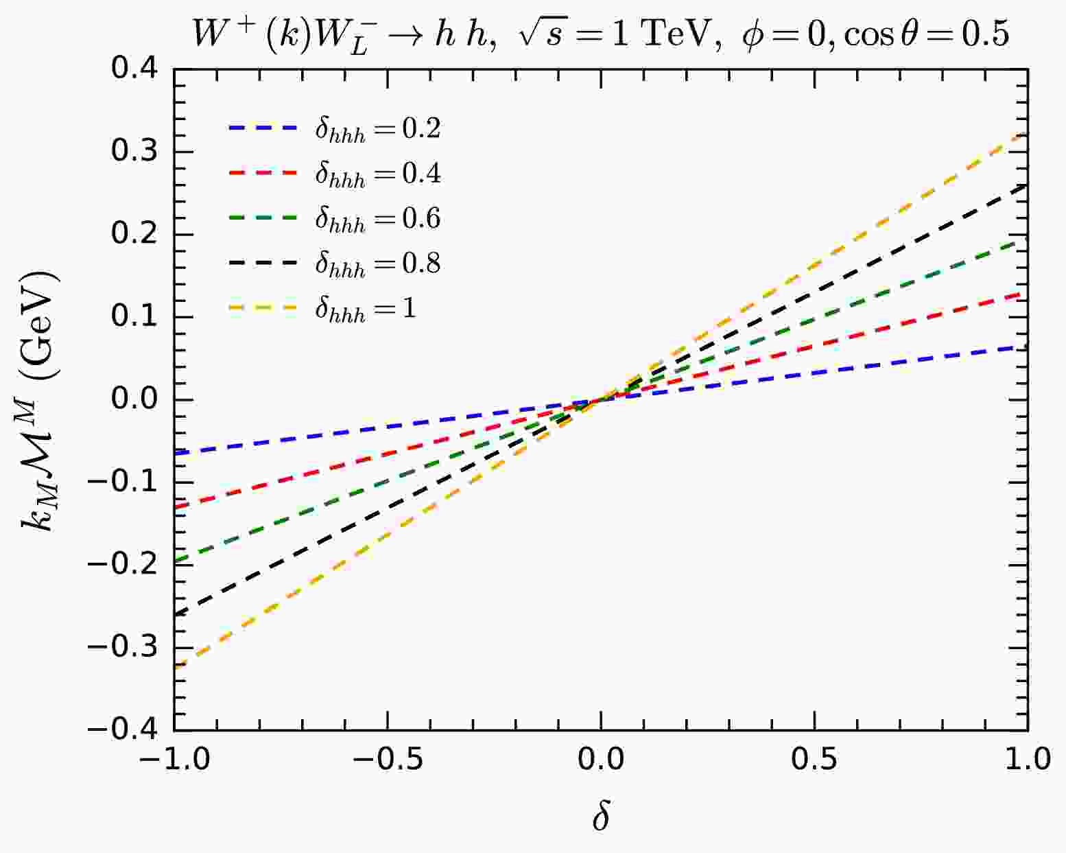 $ \delta = 0 $ corresponds to the relation (20) that respects gauge symmetry. We take$ \delta_{hhh} $ to be$ 0.2 $ ,$ 0.4 $ ,$ 0.8 $ , and$ 1 $ . For every$ \delta_{hhh} $ value, we compute$ k_M{\cal{M}}^M $ as a function of δ for the$ WW\rightarrow h h $ process with one W polarization vector replaced by the 5-component momentum. The results are summarized in Fig. 16. As can be seen in the figure,$ k_M{\cal{M}}^M = 0 $ only appears when$ \delta =0 $ , i.e., when the relation (20) holds. This confirms our argument that, with an anomalous coupling of$ \lambda_{hhh} $ , gauge symmetry can be restored by adding an proper anomalous coupling of$ \lambda_{hh\varphi\varphi} $ .Figure 16. (color online)