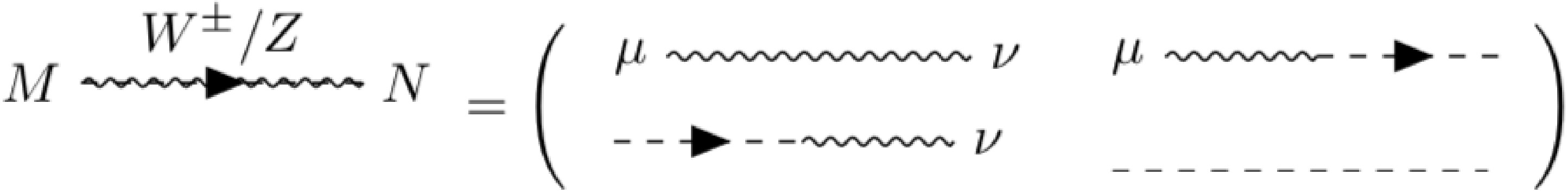 With the polarization vectors and the propagator expressed in the 5-component formalism, it is natural to extend this framework to vertices involving massive vector bosons. To reflect this property, we introduce a double-line notation by overlapping a wavy line with a dashed line to represent the massive vector boson in Feynman rules: the wavy line represents the gauge components, while the dashed line represents the Goldstone component. As examples of this double-line notation, we illustrate the decomposition of the vector boson propagator in Fig. 1 and that of the