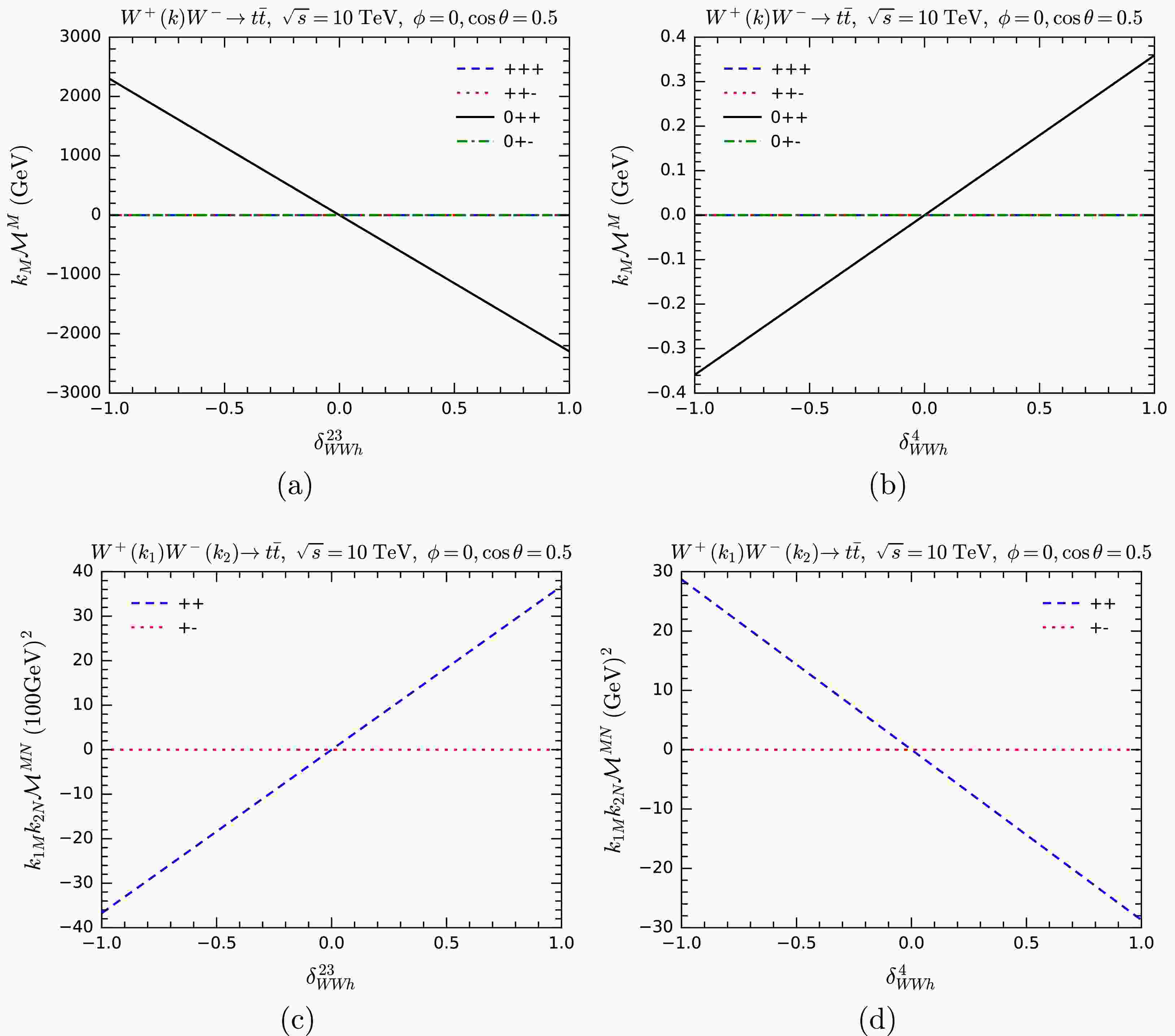 $ k_M{\cal{M}}^M $ or$ k_{1M} k_{2N} {\cal{M}}^{MN} $ for these processes as a way of testing gauge symmetry by replacing polarization vectors of one or two W bosons with 5-component momenta. The results are shown in Fig. 6 for$ WW\rightarrow hh $ and Fig. 7 for$ WW\rightarrow t\bar t $ , respectively. For$ WW\rightarrow t\bar t $ , we analyze various helicity combinations. In certain helicity configurations, the results consistently vanish due to the violation of angular momentum conservation. Apart from these cases, the anomalous couplings lead to violations of the MWI. For$ WW\rightarrow t\bar t $ , the deviations for$ \delta^{23}_{WWh} $ are larger than those for$ \delta^4_{WWh} $ .Figure 6. (color online)