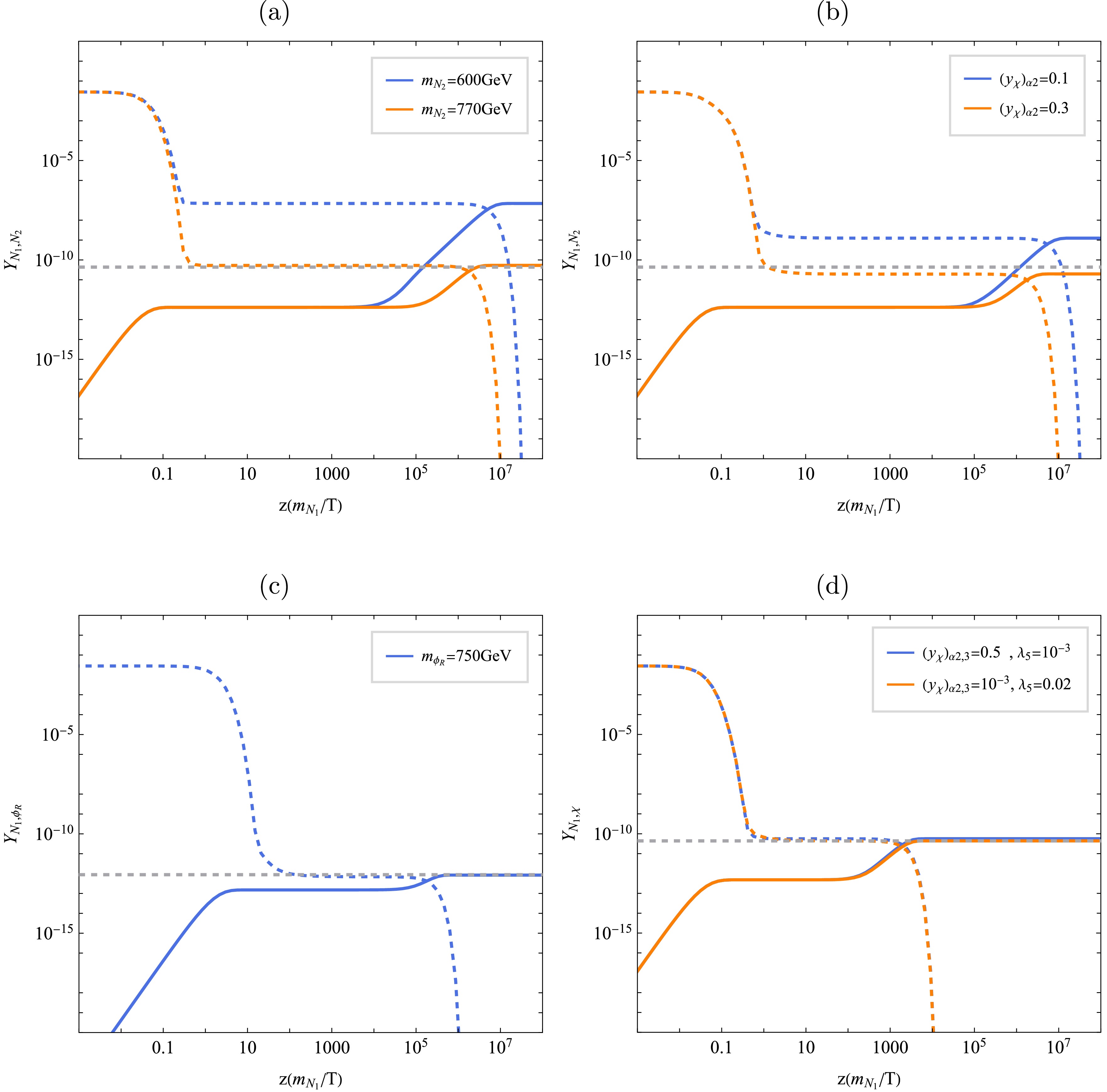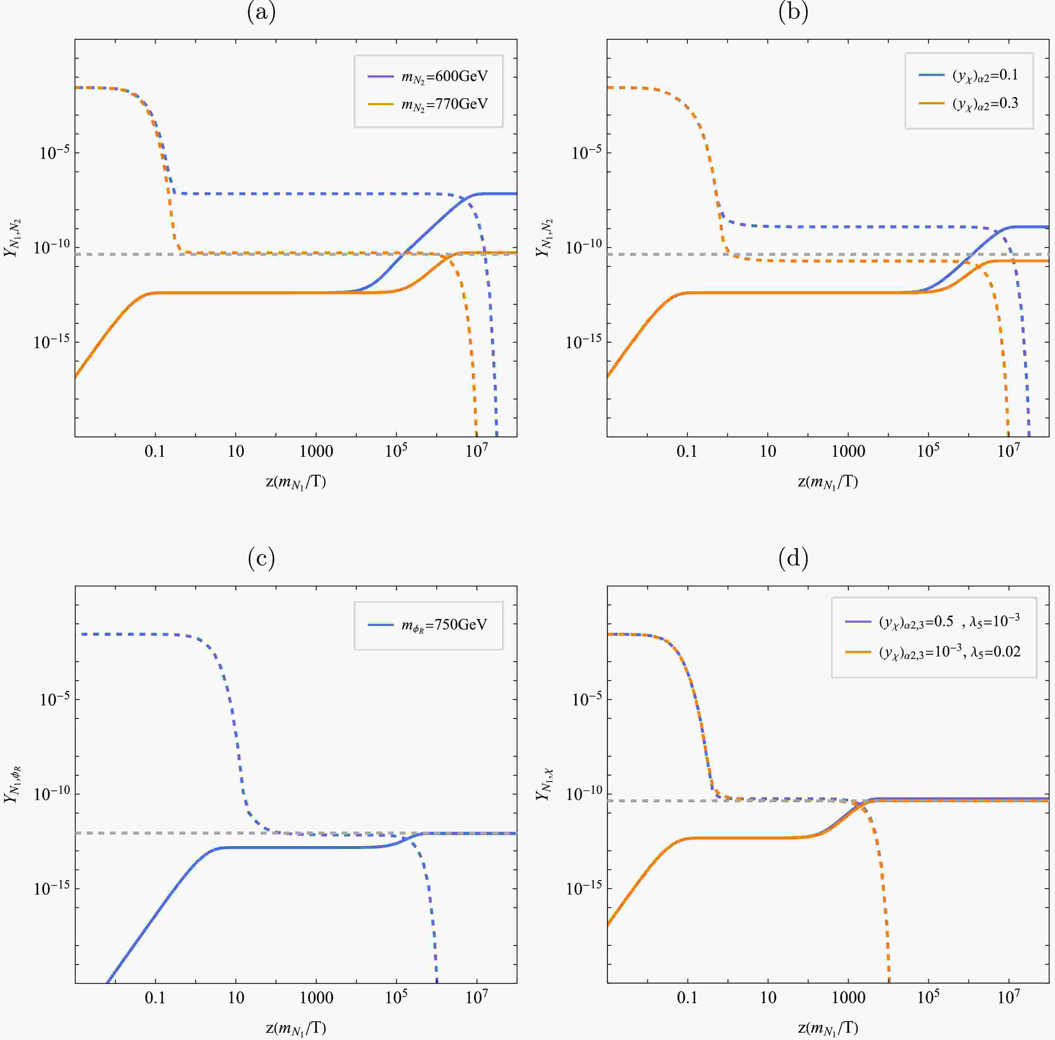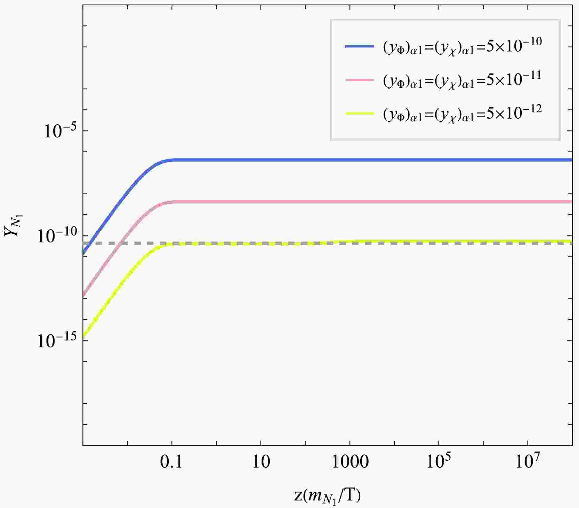 $ \bar{N}_1 $ and decays of$ \bar{N}_2 \to N_1(\bar{N}_1) $ , whose widths are similar as in Eqns. 7 to 11, should also be taken into account to get the total abundance of dark matter. To ensure$ N_1 $ remains out of thermal equilibrium, the decay rate should be smaller than the Hubble expansion rate. A rough estimate requires the Yukawa coupling$ (y_{\Phi,\chi})_{\alpha 1} \lesssim 10^{-7} $ , for scalar masses at$ {\cal{O}}(\rm TeV) $ .The evolution of dark matter and relevant particles are governed by the following Boltzmann equations: