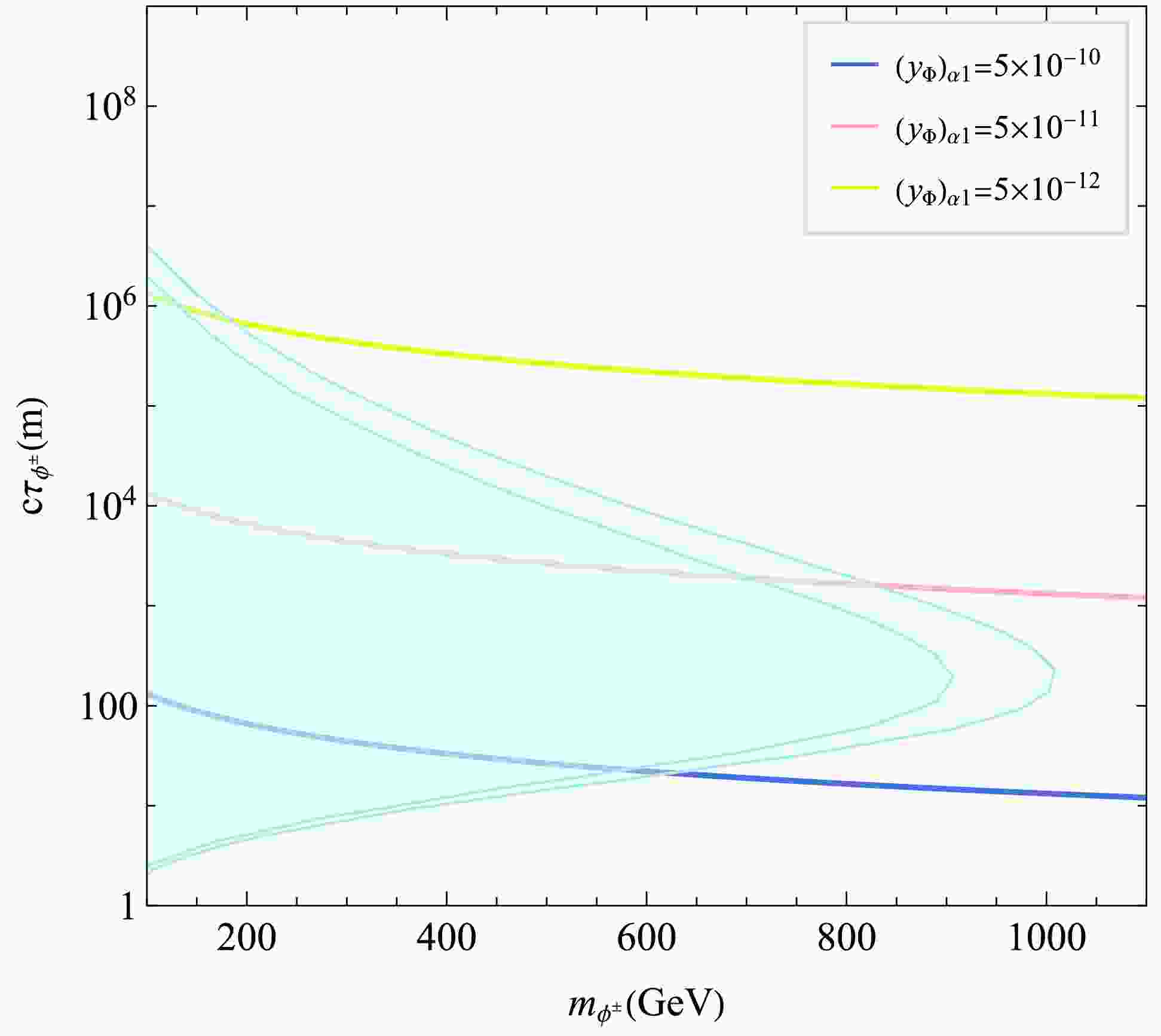$ \phi^\pm $ when it acts as the NLOP. Being electrically charged and long-lived (due to suppressed decays into$ N_1 $ ),$ \phi^\pm $ behaves as a long-lived charged particle. The ATLAS Collaboration has recently searched for such states in$ 140\; {\rm{fb}}^{-1} $ of$ pp $ collision data at$ \sqrt{s} = 13\; {\rm{TeV}} $ , using signatures based on high specific ionization energy loss and time-of-flight measurements [72]. Interpreting their results in the context of stau-to-gravitino decays, ATLAS excludes masses up to$ 560\; {\rm{GeV}} $ for such long-lived charged particles. Furthermore, in Fig. 4 we give the assessment of the projected sensitivity of future long-lived particle detector MATHUSLA [73]. Fig. 4 shows the projected reach in the mass-decay length plane of a long-lived$ \phi^\pm $ [73], assumed to be pair-produced via Drell-Yan processes at the 14 TeV HL-LHC and to decay into dark matter. The reconstruction efficiency is assumed in 0.5–1. Contours indicate regions where at least four events are expected with 3 ab$ ^{-1} $ . In Fig. 4 we also show the Yukawa coupling strength as a function of mass and decay length. Nevertheless, for the parameter space that yields the correct dark matter relic density, MATHUSLA's projected coverage remains limited to only a marginal segment.