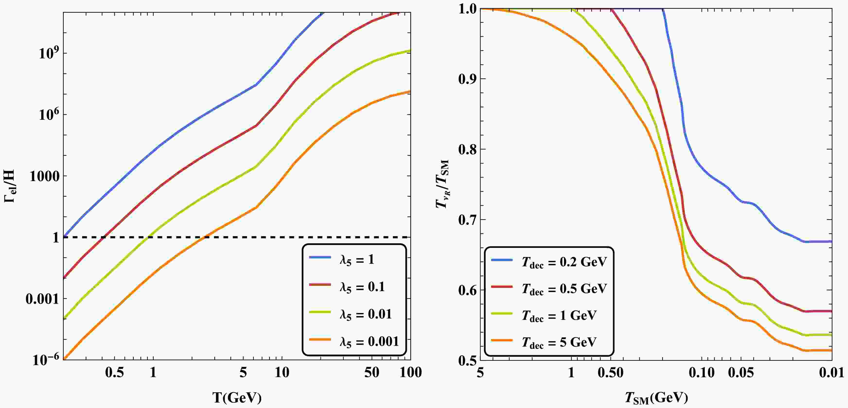 $ \Gamma_{\rm el}/H $ as a function of temperature for different choice of$ \lambda_5 $ . Here we have chosen$ m_\chi = 100\; \rm{GeV} $ for demonstration. (Right panel) The evolution of ratio$ T_{\nu_R}/T_\gamma $ for different dark plasma decoupling temperature.$ \begin{aligned} \frac{T_{\nu_R}}{T_{\rm SM}} = \left( \left. \frac{g_{\rm DP}^{*s}}{g_{\rm SM}^{*s}} \right|_{T_{\rm dec}} \frac{g_{\rm SM}^{*s}}{g_{\rm DP}^{*s}} \right)^{1/3}, \end{aligned} $