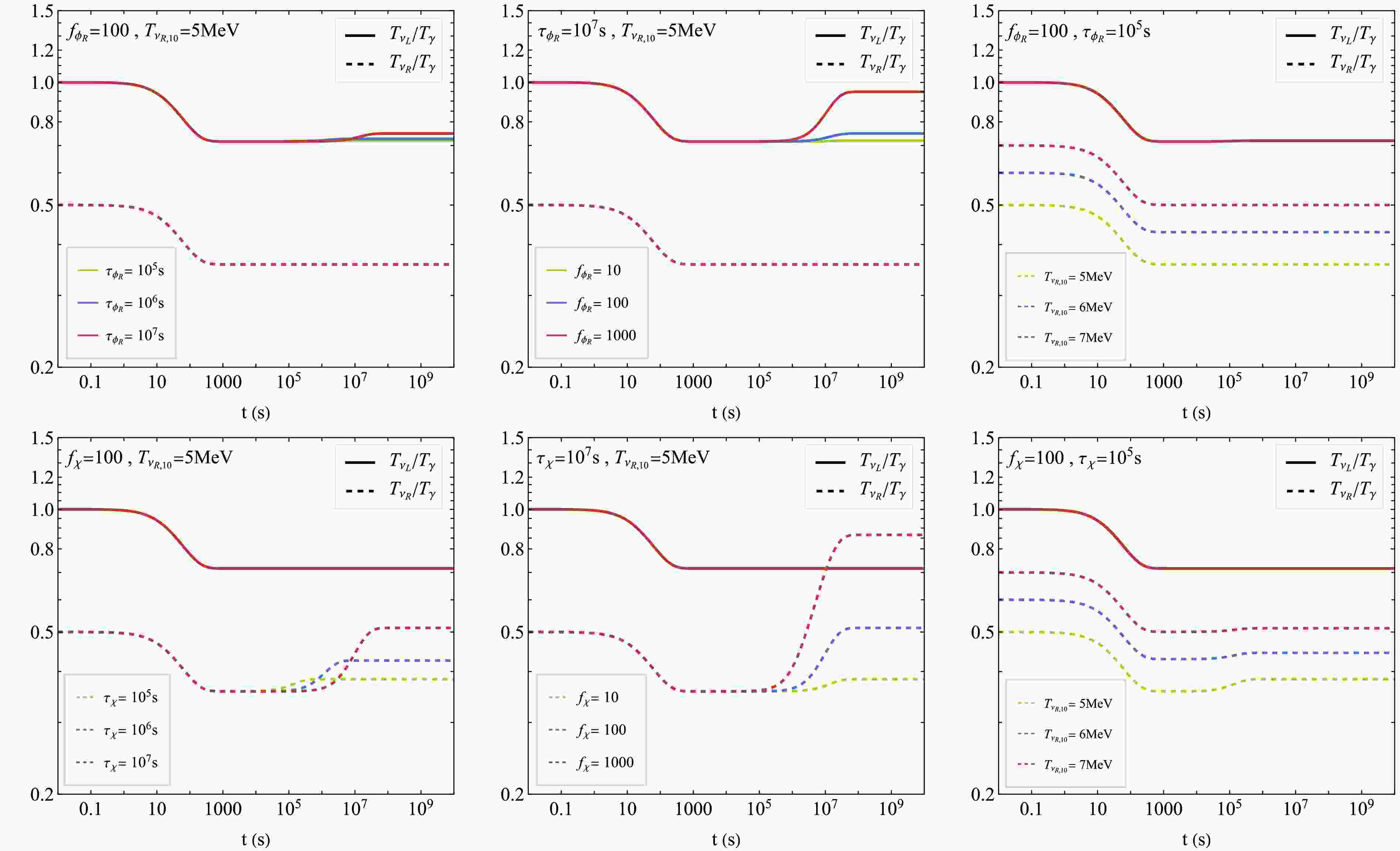 $ T_{\nu_L}/T_\gamma $ (solid lines) and$ T_{\nu_R}/T_\gamma $ (dashed lines) in Fig. 6, where the first row corresponds to$ \phi_R $ as the NLOP and the second row to χ as the NLOP. The input parameters for Eqs. (17) and (18) are the NLOP energy fraction$ f_{{\rm{NLOP}}} $ , its lifetime$ \tau_{{\rm{NLOP}}} $ , and the temperature of the right-handed neutrino bath at$ T_\gamma = 10\; {\rm{MeV}} $ , denoted$ T_{\nu_R,10} $ . We illustrate how different choices of these parameters influence the resulting temperature ratios. In the first column, we fix$ f_{{\rm{NLOP}}} = 100 $ and$ T_{\nu_R,10} = 5\; {\rm{MeV}} $ . The NLOP lifetimes are set to$ 10^5\; {\rm{s}} $ ,$ 10^6\; {\rm{s}} $ , and$ 10^7\; {\rm{s}} $ for illustration. As the lifetime of$ \phi_R(\chi) $ increases, the delayed decay injects energy into$ \nu_L(\nu_R) $ at a later cosmic time, leading to a more pronounced heating effect on$ \nu_L(\nu_R) $ . In the second column, we fix$ \tau_{{\rm{NLOP}}} = 10^7\; {\rm{s}} $ and$ T_{\nu_R,10} = 5\; {\rm{MeV}} $ , and vary$ f_{{\rm{NLOP}}} = 10 $ ,$ 100 $ , and$ 1000 $ . A larger$ f_{\phi_R}(\chi) $ implies a higher relic density after freeze-out, resulting in greater energy injection into$ \nu_L(\nu_R) $ once the decays are complete. In the third column, we examine the impact of varying$ T_{\nu_R,10} $ on the temperature ratio evolution. When$ \phi_R $ is the NLOP, its late decay does not affect the thermal history of$ \nu_R $ , and hence there is no heating of$ \nu_R $ . When χ is the NLOP, variations in$ T_{\nu_R,10} $ do not influence$ T_{\nu_L}/T_\gamma $ , since χ decays exclusively into$ \nu_R $ . A higher$ T_{\nu_R,10} $ results in a larger$ T_{\nu_R}/T_\gamma $ at the completion of χ decay.