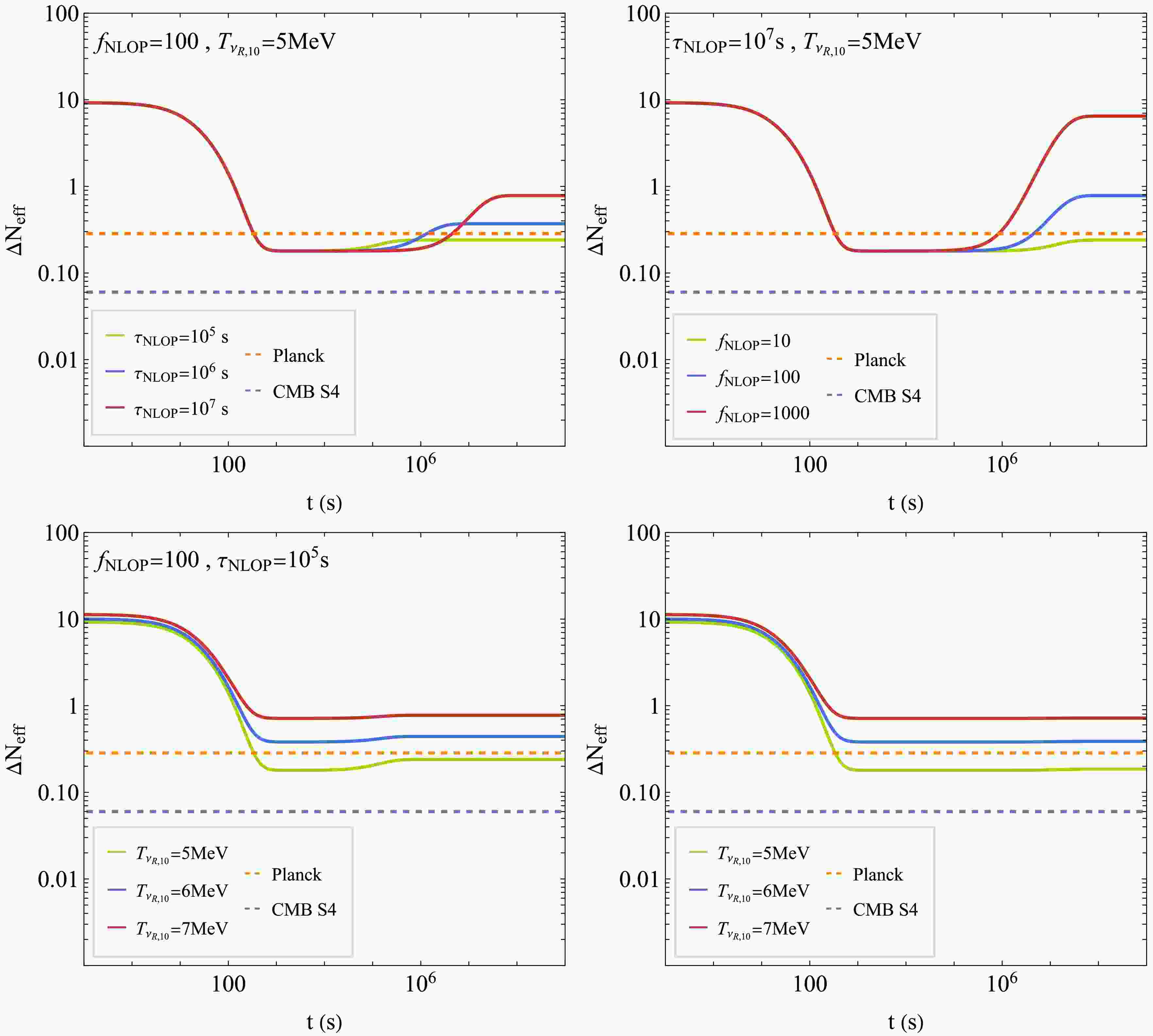 $ T_{\nu_L} $ ,$ T_{\nu_R} $ , and$ T_\gamma $ determined,$ \Delta N_{{\rm{eff}}} $ can be computed using Eq. (15). From Eq. (17), it follows that the energy injection from NLOP decay into$ \nu_L $ or$ \nu_R $ proceeds in an identical manner in both scenarios. As a result, the evolution of$ \Delta N_{{\rm{eff}}} $ is the same whether the NLOP is$ \phi_R $ or χ. We present the resulting$ \Delta N_{{\rm{eff}}} $ in Fig. 7, where the three subfigures show the effects of varying$ \tau_{{\rm{NLOP}}} $ ,$ f_{{\rm{NLOP}}} $ , and$ T_{\nu_R,10} $ , respectively. The two dashed lines stand for the current experimental limits from Planck [77] and future detecting capability from CMB-S4 [78]. A longer NLOP lifetime or a larger$ f_{{\rm{NLOP}}} $ leads to a more pronounced heating effect, resulting in a higher$ \Delta N_{{\rm{eff}}} $ . A hotter$ \nu_R $ bath, originating from stronger and more prolonged interactions between the dark plasma and the SM plasma, also yields a larger$ \Delta N_{{\rm{eff}}} $ . For completeness, we also show the evolution of$ \Delta N_{{\rm{eff}}} $ in the scenario where the contribution from the late decay of the NLOP is negligible, as depicted in the final subfigure of Fig. 7. This occurs when either the NLOP abundance is small or the NLOP lifetime is sufficiently short. In this limit,$ \Delta N_{{\rm{eff}}} $ is dominated solely by the thermal contribution from the decoupled$ \nu_R $ bath. As expected, a higher$ T_{\nu_R,10} $ results in a larger$ \Delta N_{{\rm{eff}}} $ , since the$ \nu_R $ s contribute more to the radiation density. -