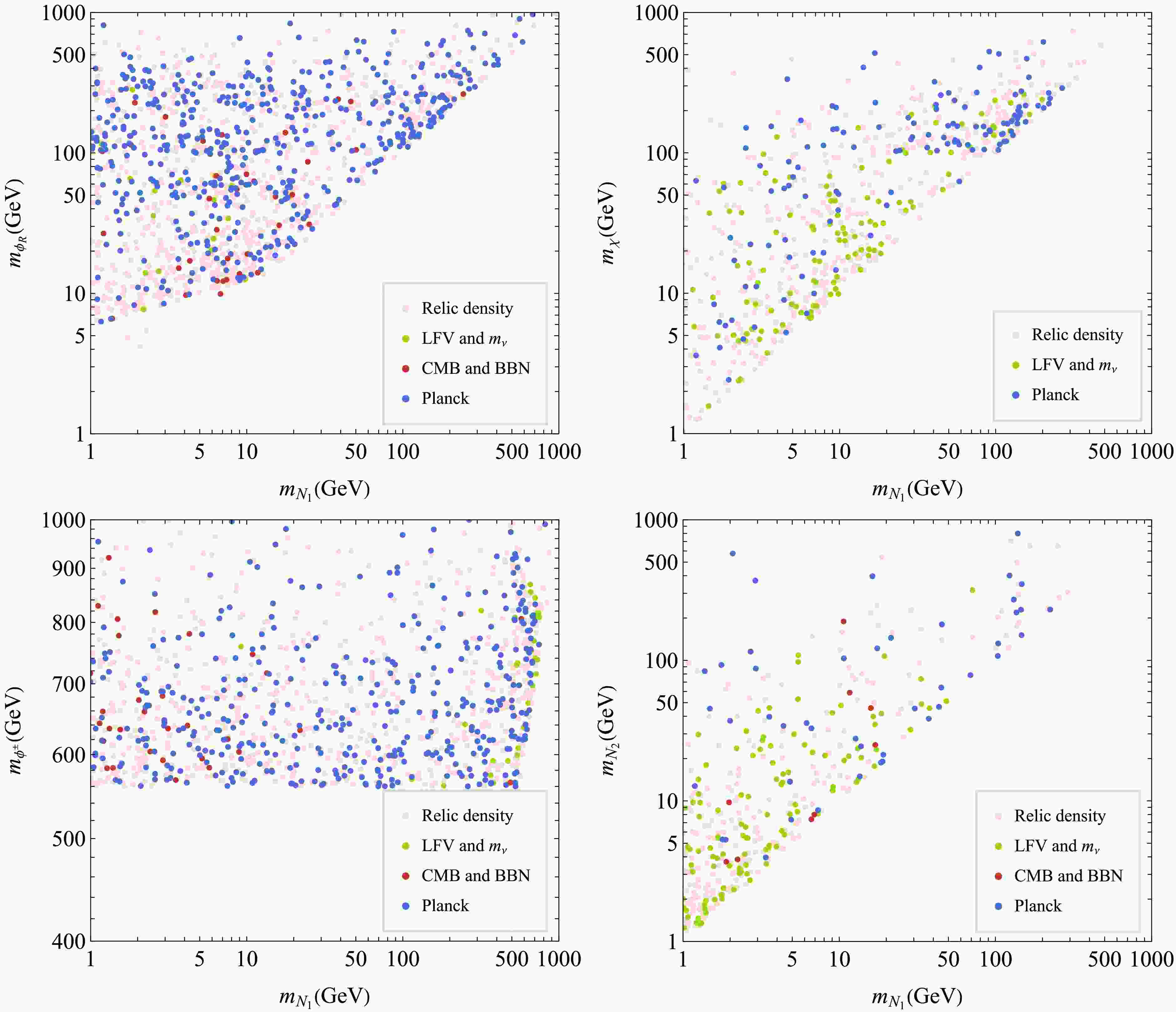 $ \tau < 3 \times 10^4 \,\text{s} $ on the lifetime of the NLOP when it is either the charged scalar$ \phi^\pm $ or the neutral fermion$ N_2 $ . This bound arises because EM energy injection from late decays can alter light element abundances during BBN and distort CMB anisotropies. However, when the NLOP is the neutral scalar$ \phi_R $ , the constraints are significantly relaxed, as its dominant decays inject energy primarily into neutrinos rather than the EM plasma. In this case, we adopt the bounds from Ref. [80], which depend on the effective energy transfer parameter$ f_{\phi_R} \varepsilon_{\phi_R} $ , and display them as the blue curve in Fig. 8. In the scan, parameter points satisfying the dark matter relic density condition are colored pink. Among these, points that additionally satisfy constraints from neutrino mass and LFV processes are highlighted in green. Points that further pass the BBN and CMB bounds are shown in red. One can observe that the BBN and CMB limits exclude long-lived$ \phi_R $ with lifetimes$ \gtrsim 10^4 $ –$ 10^7\,\text{s} $ , although the constraints weaken significantly when the energy transferred to the neutrino sector is small. When the NLOP is the scalar χ, which decays directly into right-handed neutrino, there are no direct BBN or CMB constraints, as the decay products are sterile and do not interact with the thermal bath.