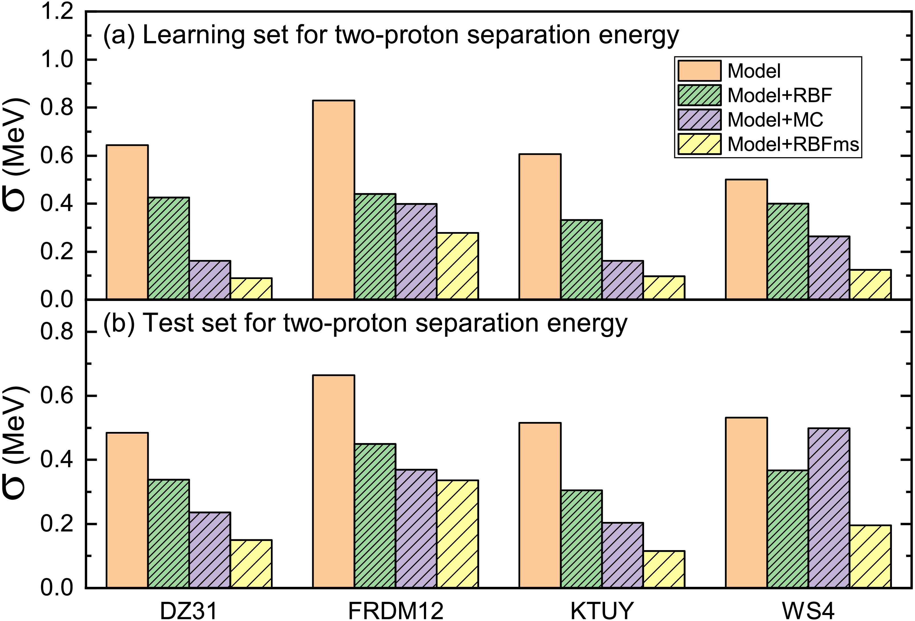 Similarly, we selected 115 nuclei from AME2012 [48] as the learning set for two-proton separation energy, while the test set includes 40 nuclei from AME2020 + NM50 which lie just outside the AME2012. Figure 2 illustrates the rms deviations of the learning and test sets for two-proton separation energy obtained using four nuclear mass models in conjunction with two machine learning approaches and MC method. As can be seen from Fig. 2, for the description of the learning and test sets of the two-proton separation energy, the RBF, MC, and RBFms methods all can improve the results of the nuclear mass model. Among all evaluated methods, the RBFms approach demonstrated the most substantial enhancement in prediction accuracy. Specifically, when applied to the DZ31 model, RBFms approach achieved a learning set rms deviation of 0.089 MeV for two-proton separation energy predictions. The RBFms approach exhibits significantly enhanced predictive accuracy for two-proton separation energy compared to the MC method. This performance advantage, however, is not observed in one-proton separation energy predictions. The observed performance discrepancy may stem from the RBF method's inherent limitations in capturing nuclear odd-even effect induced oscillation patterns, particularly in one-proton separation energy predictions.