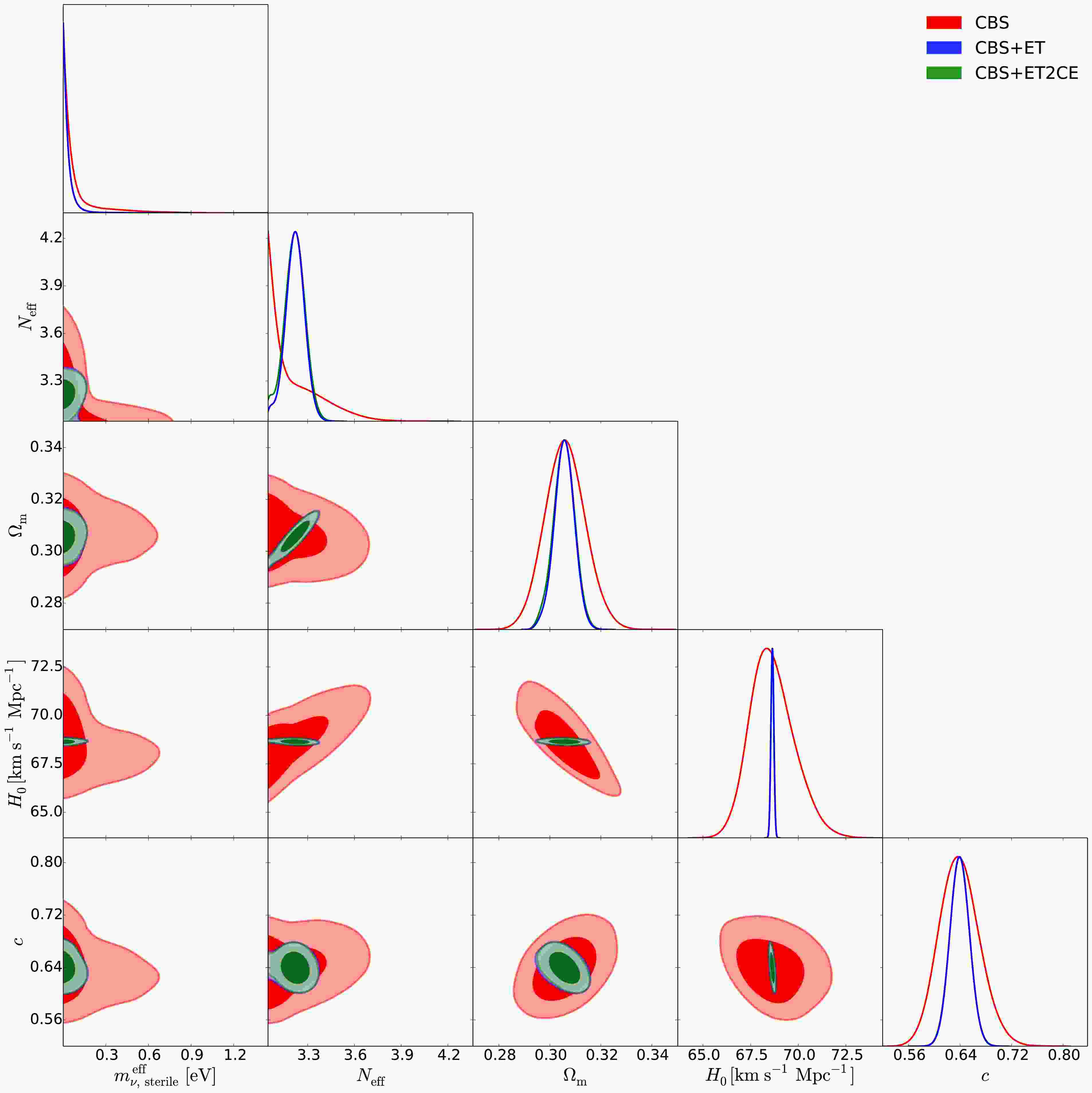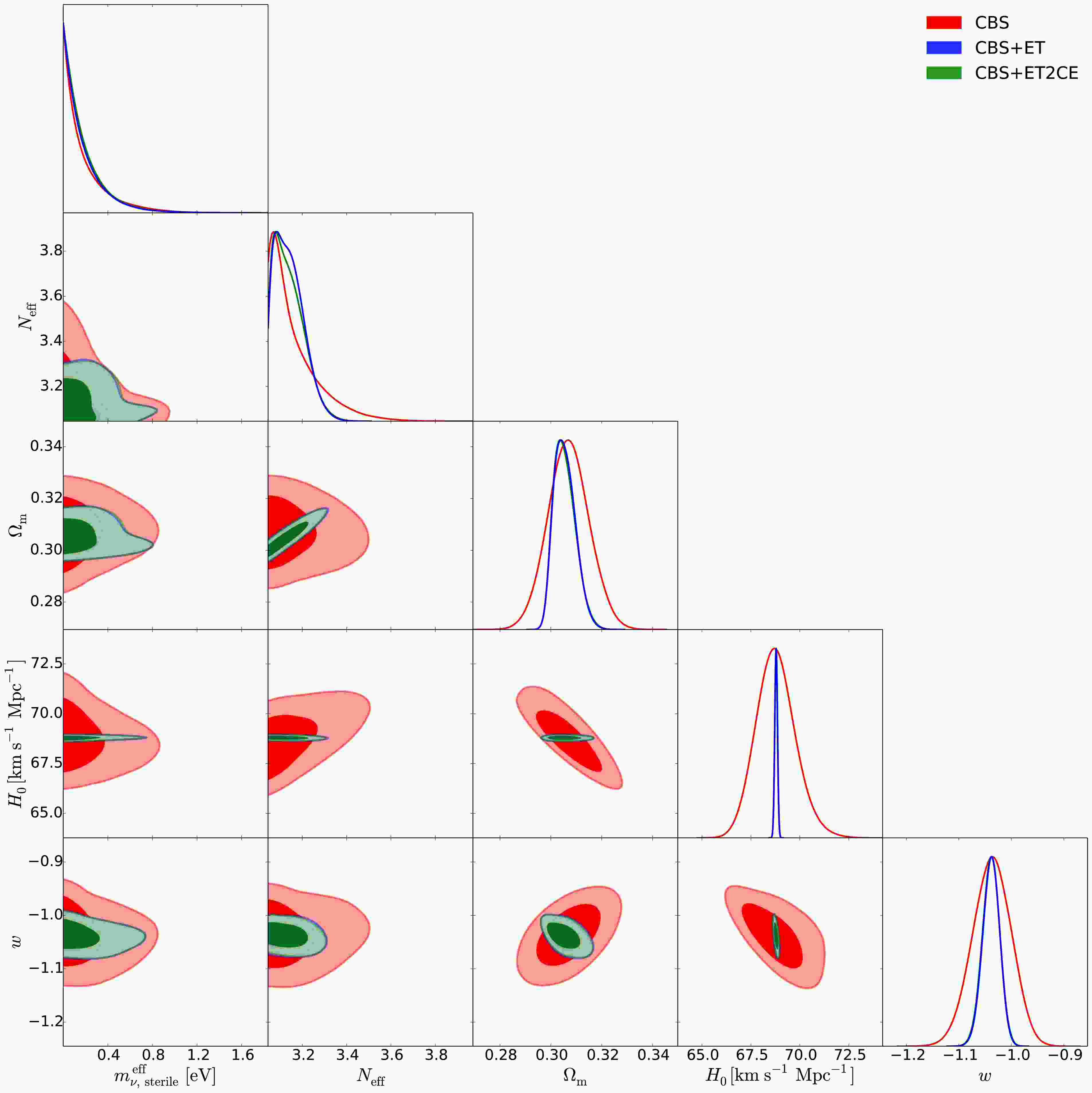 $\mathtt{CosmoMC}$ [178] to infer the posterior probability distributions of the cosmological parameters. To demonstrate the impact of simulated GW data on constraining sterile neutrino parameters, we will analyze two scenarios of 3G GW observations: a single ET and the ET-CE-CE network, which consists of one ET detector and two CE-like detectors (one in the United States with a 40 km arm length and another one in Australia with a 20 km arm length, hereafter referred to as ET2CE). We utilize the ET sensitivity curve provided in Ref. [179] and the CE sensitivity curves from Ref. [180], as presented in Fig. 1 of Ref. [39]. For the GW detectors, due to the large uncertainty in the duty cycle, we consider only the ideal scenario in which all detectors are assumed to have a 100% duty cycle, as discussed in Ref. [181]. The geometry of the GW detector, characterized by parameters such as latitude ($ \varphi $ ), longitude ($ \lambda $ ), opening angle ($ \zeta $ ), and arm bisector angle ($ \gamma $ ), is described in detail in Table I of Ref. [39]. To ensure a direct comparison of constraints within the same parameter space, we adopt the best-fit cosmological parameter values from the CBS dataset as the fiducial values for simulating GW data in dynamical DE models. Thus, in our analysis, we use three data combinations: (1) CBS, (2) CBS+ET, and (3) CBS+ET2CE. We will report the constraint results in the next section.Figure 1. (color online) he triangular plots of the marginalized posterior distributions for cosmological parameters in the wCDM+