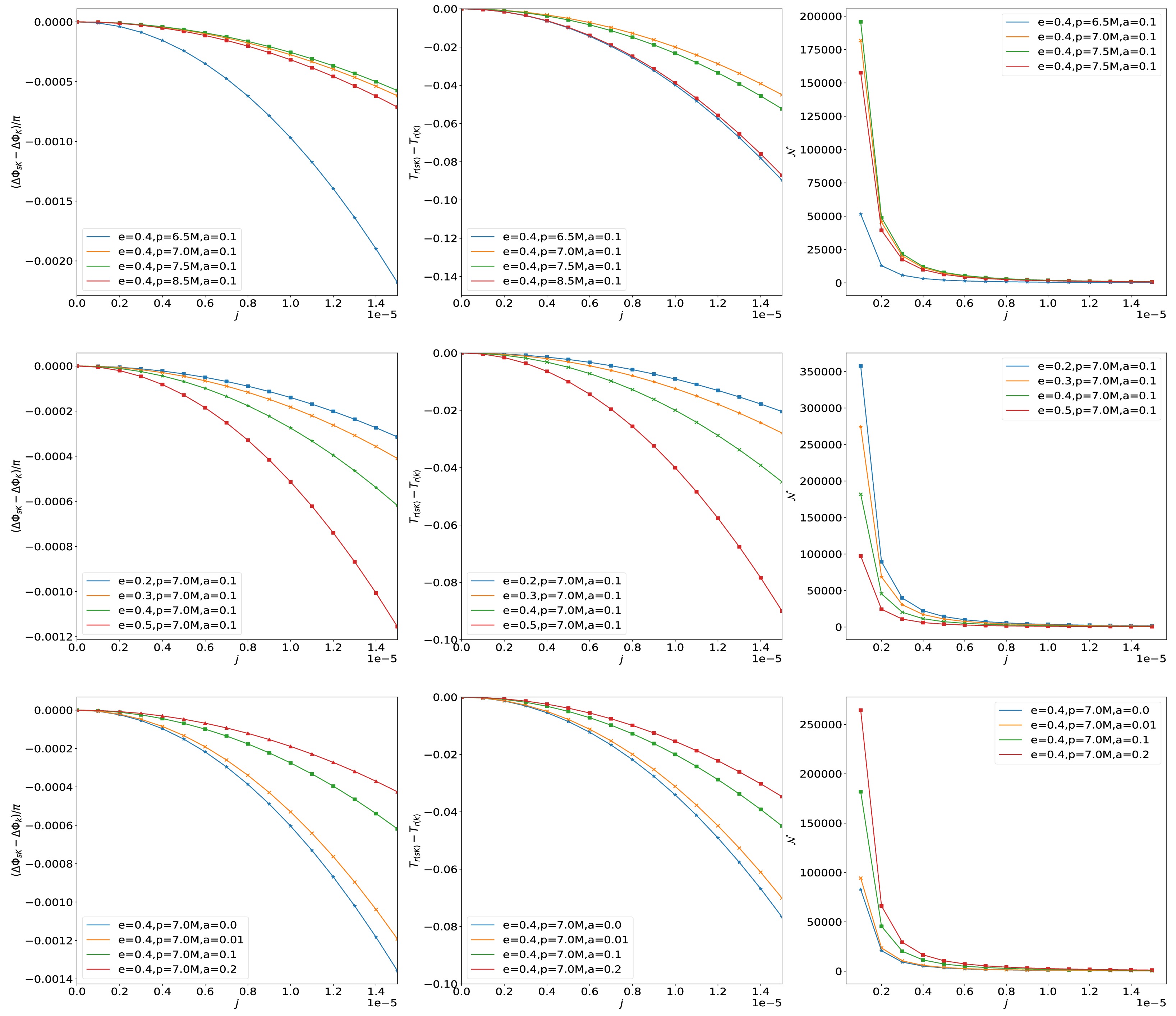 $ (0, a, M, e_0, p_0) $ and$ (j, a, M, e_0+ \delta e, p_0+ \delta p) $ have the same orbital frequencies. The black hole spin parameter is set to$ a = 0.5 $ in the left and right panels, and the black hole mass parameter is set to$ M = 2\times10^{5}M_{\odot} $ in the left and middle panels. The orbit parameters are set to$ e_0 = 0.4 $ and$ p_0 = 7.0 $ in each panel. -
