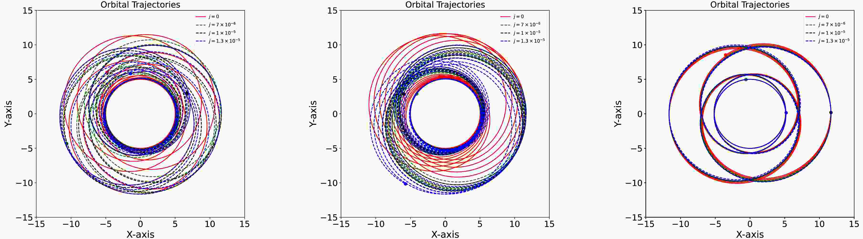Figure 3. (color online) Trajectories with the orbital parameters