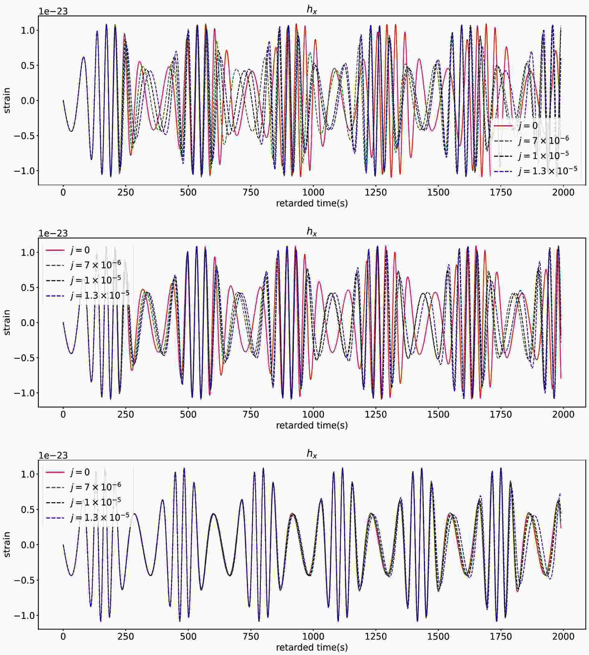 Figure 5. (color online) The cross component of EMRI waveforms for different swirling parameter j. The top, middle and bottom rows respectively correspond to the cases with centre black hole's spin