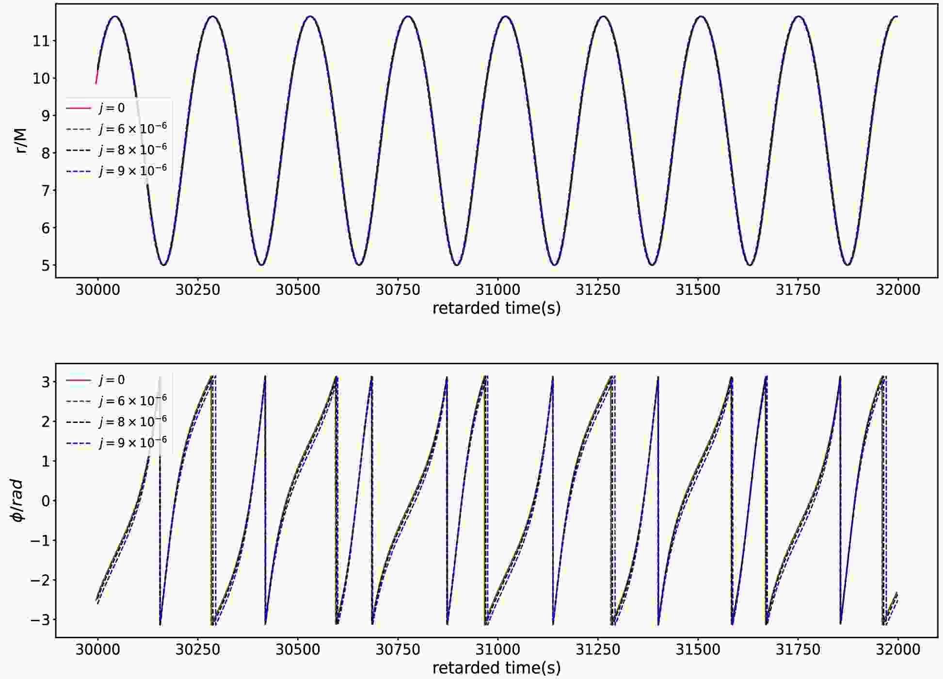 $ a = 0.1 $ , the difference arising from j is almost indistinguishable in both the r direction and ϕ direction. This means that in the rapidly rotating black hole case the effects of j can be negligible. This is rational because in this case the frame dragging of the black hole dominates over that of the background's swirling. These properties of the spacetime parameters on the geodesic orbital trajectories are also shown in the Fig. 3.