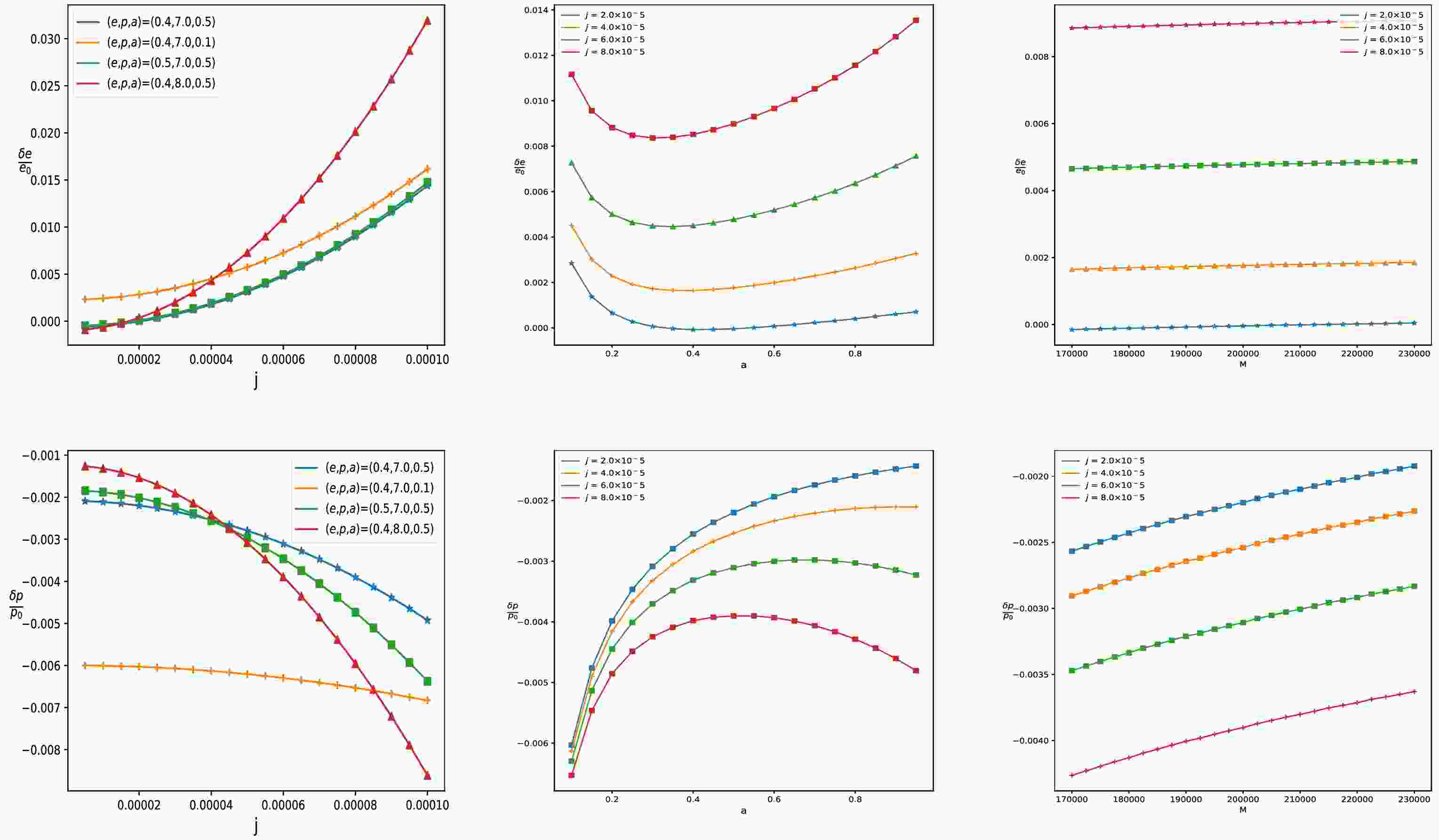 $ \delta p $ and$ \delta e $ are two small deviations of the orbital parameters. Solving above equations, we can obtain deviations$ \delta p $ and$ \delta e $ and further discuss confusion problem arising from orbital parameters e and p for fixed M, a and j. In Fig. 8, we present the relationship between the relative variations of orbital parameters and the black hole parameters j, a and M through matching the orbital frequency of Kerr and swirling-Kerr black holes. The results reveal that$ \delta e/e_0 $ increases rapidly and$ \delta p/p_0 $ decreases rapidly as j increases, which means that changes of the swirling parameter j must adjust the orbital parameters e and p to preserve consistent orbital frequencies. As the black hole spin parameter a increases,$ \delta e/e_0 $ first decreases and then increases, whereas the change in$ \delta p/p_0 $ is exactly the opposite of that. This means that effects of the background rotation parameter j on the relative variations$ \delta e/e_0 $ and$ \delta p/p_0 $ are distinctly different from those of the black hole spin parameter a. With the increase in the black hole mass M, both$ \delta e/e_0 $ and$ \delta p/p_0 $ increase, but$ \delta p/p_0 $ has a higher rate of change. Furthermore, we find that the change tendencies of$ \delta e/e_0 $ and$ \delta p/p_0 $ with the parameter j are similar to those observed with the MOG parameter α in the STVG[47], but the rates are different. Through above analysis, we find that the confusion problem also exists in the swirling-Kerr case.