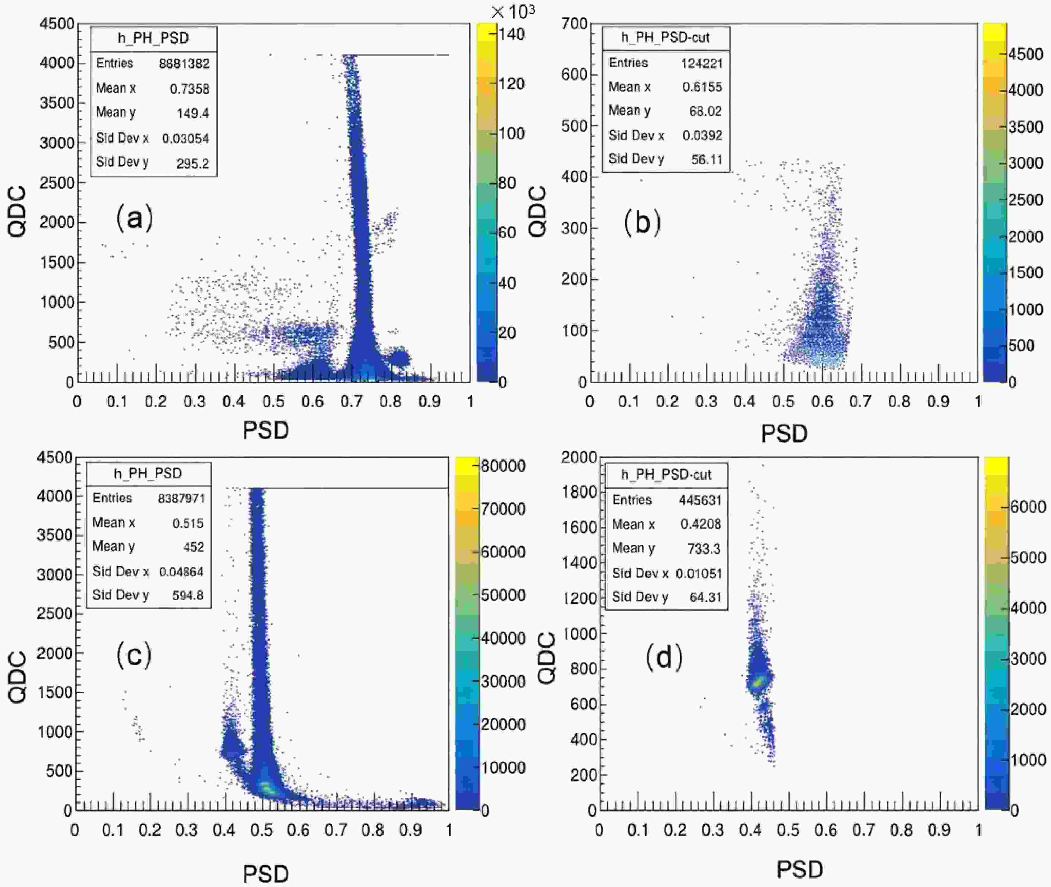 (1) The Q_long and Q_short parameters were iteratively adjusted in the algorithm until the neutron and gamma events could be clearly separated in the 2D PSD spectrum. The final integration windows were determined to be 230 ns (Q_long) and 40 ns (Q_short) for the EJ-309 detector, and 1000 ns (Q_long) and 200 ns (Q_short) for the CLYC detector. Once suitable parameters were found, neutron events were selected based on the PSD distribution. The PSD spectra before and after discrimination are shown in Fig.10. The chosen Q_long and Q_short settings demonstrate good discrimination performance.
