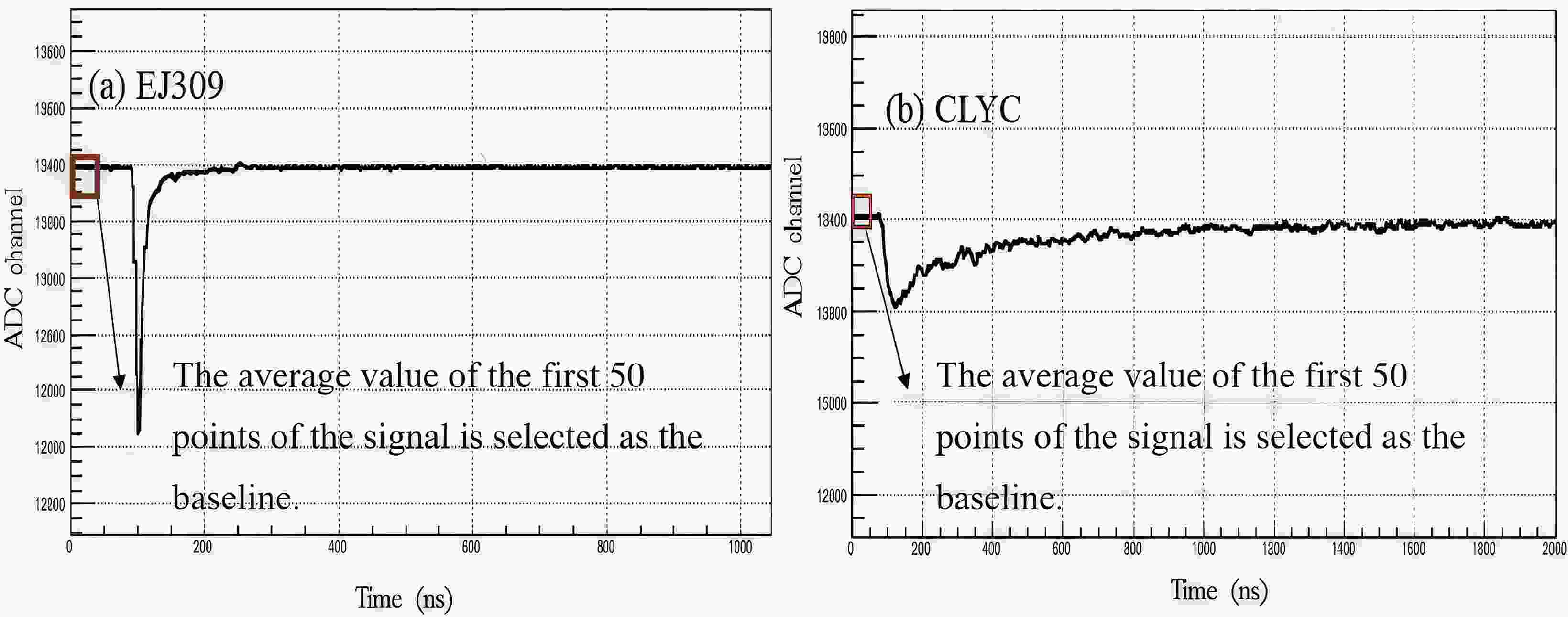During the operation of the data acquisition system, the baseline of the waveform signals tends to fluctuate. Moreover, the baseline level of each signal varies slightly due to inherent noise. Typically, the average of the initial portion of the waveform is selected as the baseline value for each signal. Figure 7. shows representative waveform signals collected from the EJ-309 and CLYC detectors.The baseline value is determined by averaging the first 50 points of the waveform, which is subtracted from each signal prior to waveform analysis through an algorithmic implementation.