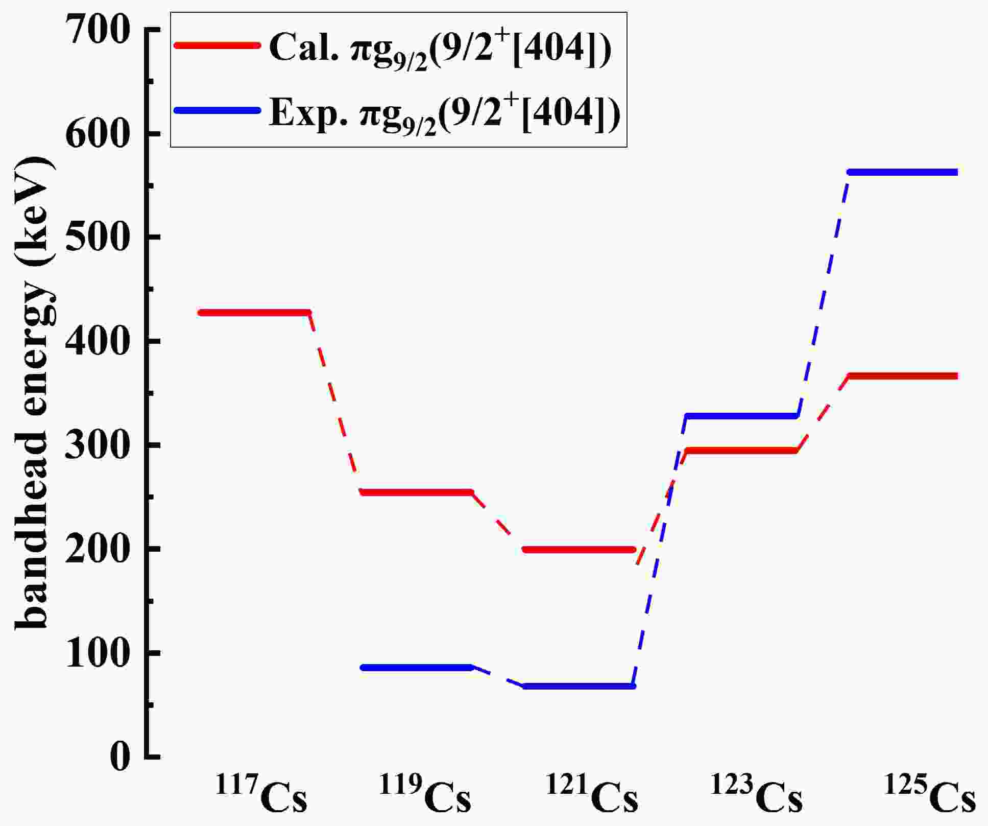 $ \pi[404] $ 9/2+ orbital in odd-even 117−125Cs. The experimental band-head energies are denoted by blue lines. The calculated band-head energies are denoted by red lines.The experimental data are taken from Refs. [9, 10, 12, 43]. -