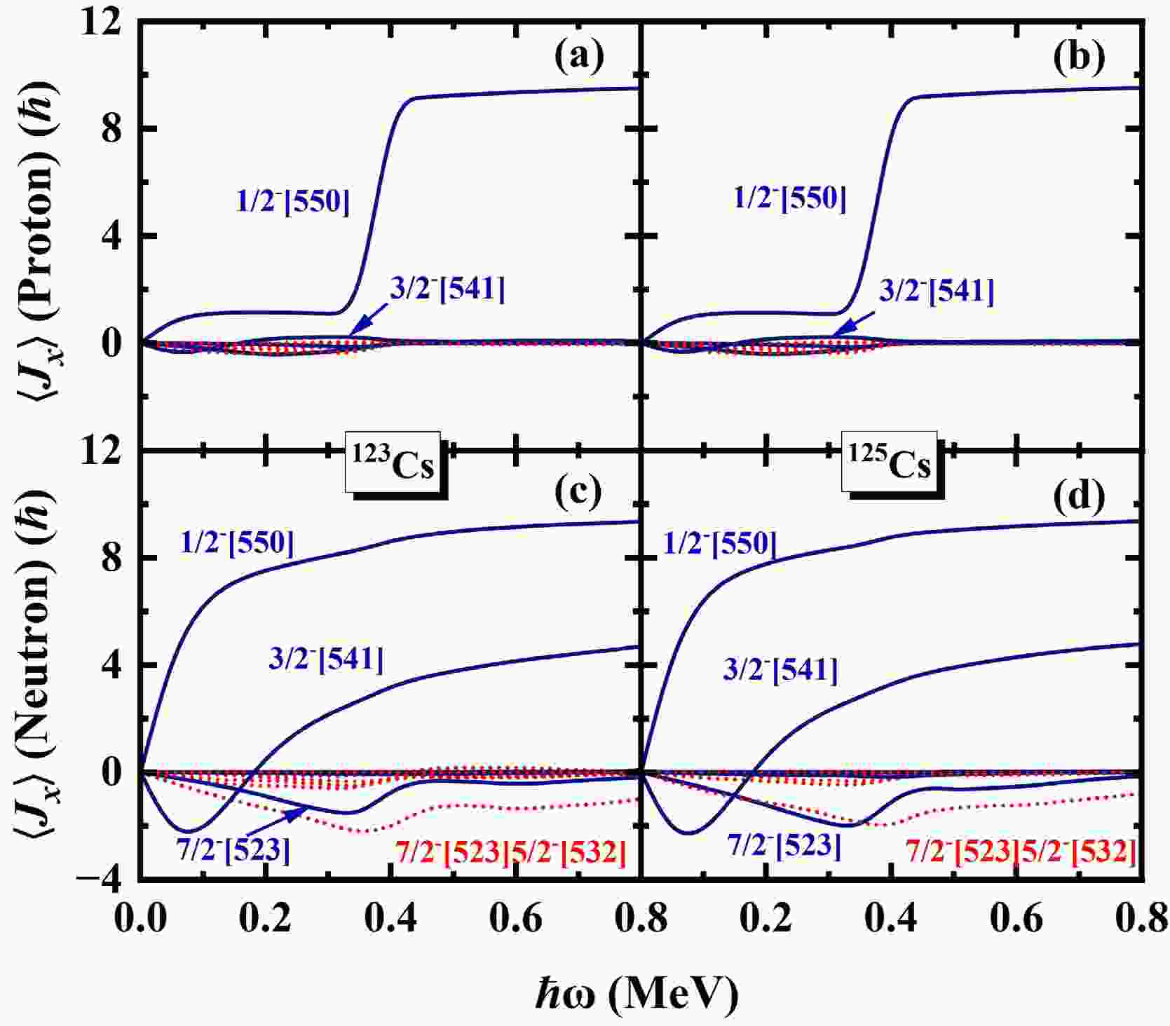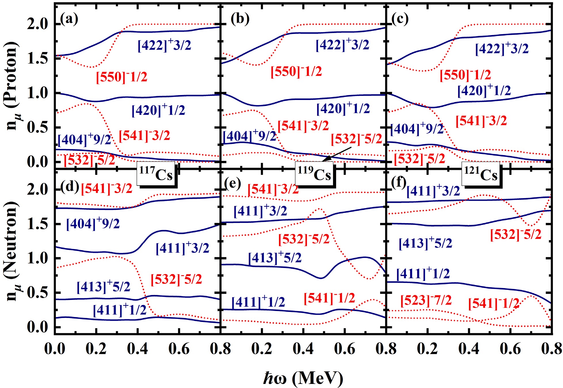 $ N=\sum_{\mu}n_{\mu} $ is exactly conserved, whereas the occupation probability$ n_{\mu} $ for each orbital varies with rotational frequency$ \hbar \omega $ . This is a key advantage of the PNC approach, as it allows for a more detailed investigation of the evolution of Nilsson levels with rotation. By analyzing the ω dependence of orbitals near to the Fermi surface, valuable insights into the upbending and backbending mechanism can be obtained. The occupation probability$ n_{\mu} $ of each orbital μ near the Fermi surface of the$ \pi d_{5/2} (1/2^+[420]) $ band in 117,119,121Cs are shown in Fig. 4. The top and bottom rows are for protons and neutrons, respectively. The positive (negative) parity is denoted by blue solid lines (red dotted lines). It is evident from Fig. 4, around the rotational frequency$ \hbar \omega\sim0.20 $ MeV for 117,119,121Cs, the occupation probability of π[550]1/2 ($ \pi h_{11/2} $ ) increases sharply from 1.5 to nearly 2.0, while the occupation probabilities of π[541]3/2 and π[532]5/2 decrease. This behavior can be understood from Fig. 2. With increasing$\hbar\omega $ , the$ \pi[541]3/2 $ and$ \pi[532]5/2 $ orbitals gradually move away from the Fermi surface, while the$ \pi[550]1/2 $ orbital approaches it. As a result, the occupation probabilities of the$ \pi[541]3/2 $ and$ \pi[532]5/2 $ orbitals decrease with increasing cranking frequency, whereas the occupation probability of the$ \pi[550]1/2 $ orbital increases. For the second upbending of 117,119,121Cs, it shows in Fig.4(d) the occupation probabilities of$ \nu[541]3/2 $ and$ \nu[411]3/2 $ increase around$ \hbar \omega\sim0.40 $ , while the occupation probability$ \nu[532]5/2 $ sharply decreases. In Fig.4(e), around the upbending frequency, the occupation probability of$ \nu[541]3/2 $ and$ \nu[532]5/2 $ increase, corresponding while other the occupation probabilities orbitals become smaller. For 121Cs, around$ \hbar \omega\sim0.70 $ MeV the occupation probability$ \nu[532]5/2 $ sharply increases, while the occupation probability$ \nu[541]1/2 $ decreases. Similarly, the occupation probability$ n_{\mu} $ of each orbital μ near the Fermi surface of the$ \pi d_{5/2} (1/2^+[420]) $ band in 123,125Cs are shown in Fig. 5. In Fig. 5, the occupation probability of$ \pi[550]1/2 $ increases gradually from nearly 0 to 2 around$ \hbar \omega\sim0.30 $ MeV, while the occpution of$ \pi[422]3/2 $ ,$ \pi[404]9/2 $ and$ \pi[420]1/2 $ decrease. For neutron, the occupation probability of ν[523]7/2 approaches 0 at$ \hbar \omega\sim0.30 $ MeV, meanwhile the occupation probabilities of other orbitals become larger. It can be seen that the first upbending of 117,119,121Cs mainly comes from the contributions of the$ \pi h_{11/2} $ orbitals and the second upbending of 117,119,121Cs mainly comes from the contributions of the$ \nu h_{11/2} $ orbitals. For 123,125Cs, the observed backbending arises predominantly from the combined contributions of both the$ \pi h_{11/2} $ and$ \nu h_{11/2} $ orbitals.