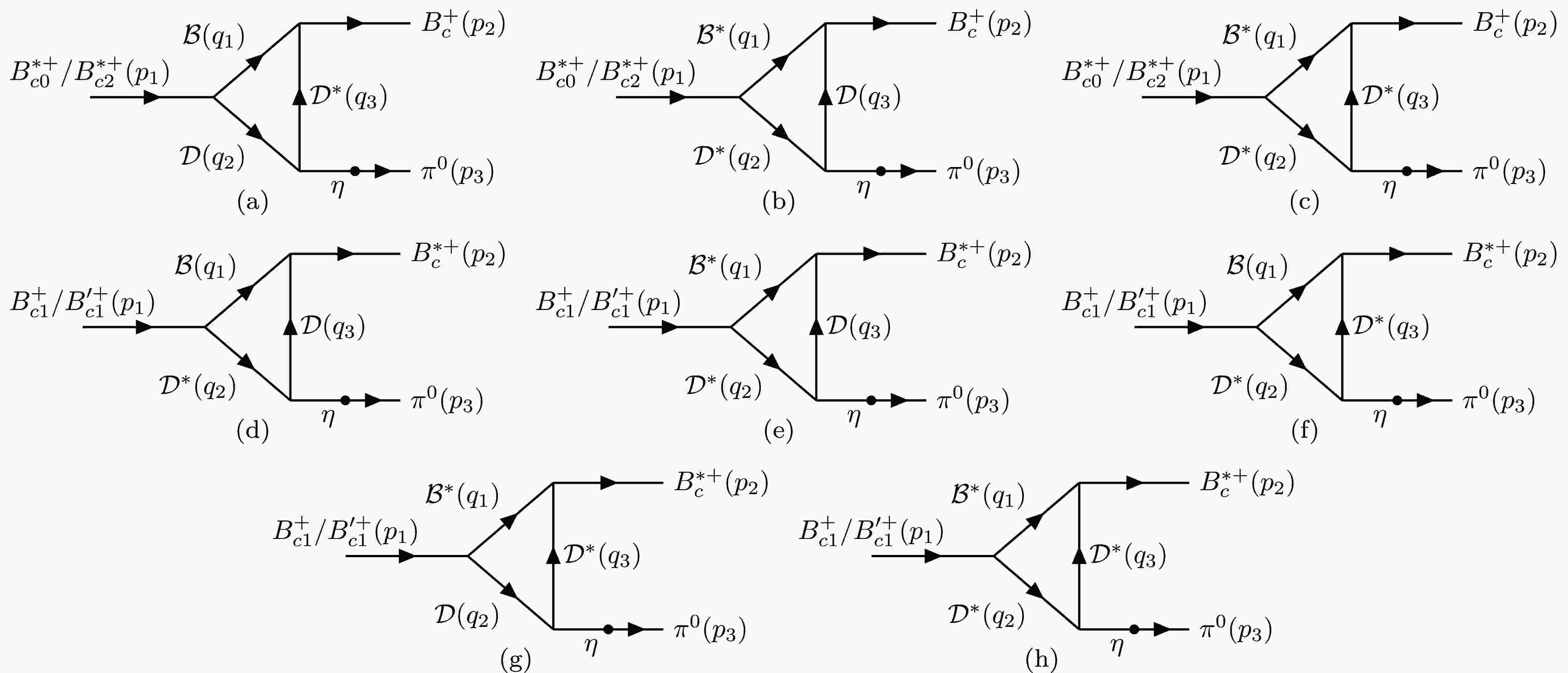 $ \eta-\pi^{0} $ mixing corresponding to Fig. 1, we denote the amplitude as$ i\mathcal{M}_k(P_1,P_2,P_3) $ , where$ k=0,2,1 $ and$ 1^{\prime} $ corresponds to$ B_{c0}^{*+},B_{c2}^{*+},B_{c1}^{+} $ and$ B_{c1}^{\prime+} $ , respectively. Here,$ P_i $ represents the intermediate meson with momentum$ q_i $ and$ B_{\mu\nu} $ denotes the polarization tensor of the initial$ B_{c2}^{*+} $ .$ \varepsilon^{i}_{\mu} $ denotes the polarization vector of the initial$ B_{c1}^{(\prime)+} $ and$ \varepsilon^{f}_{\mu} $ denotes the polarization vector of the final$ B_{c}^{*+} $ . The amplitudes corresponding to Fig. 1 can thus be expressed as