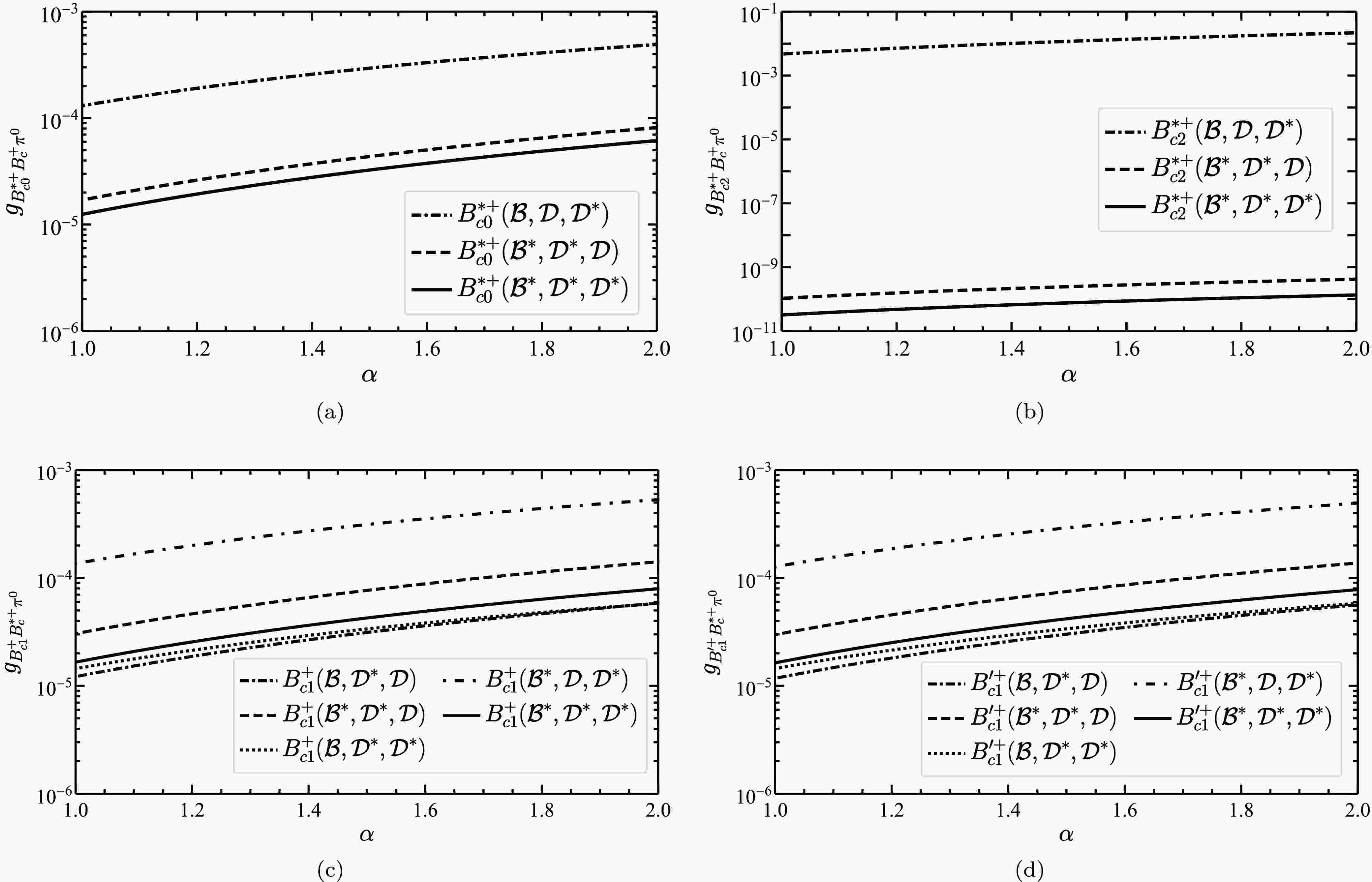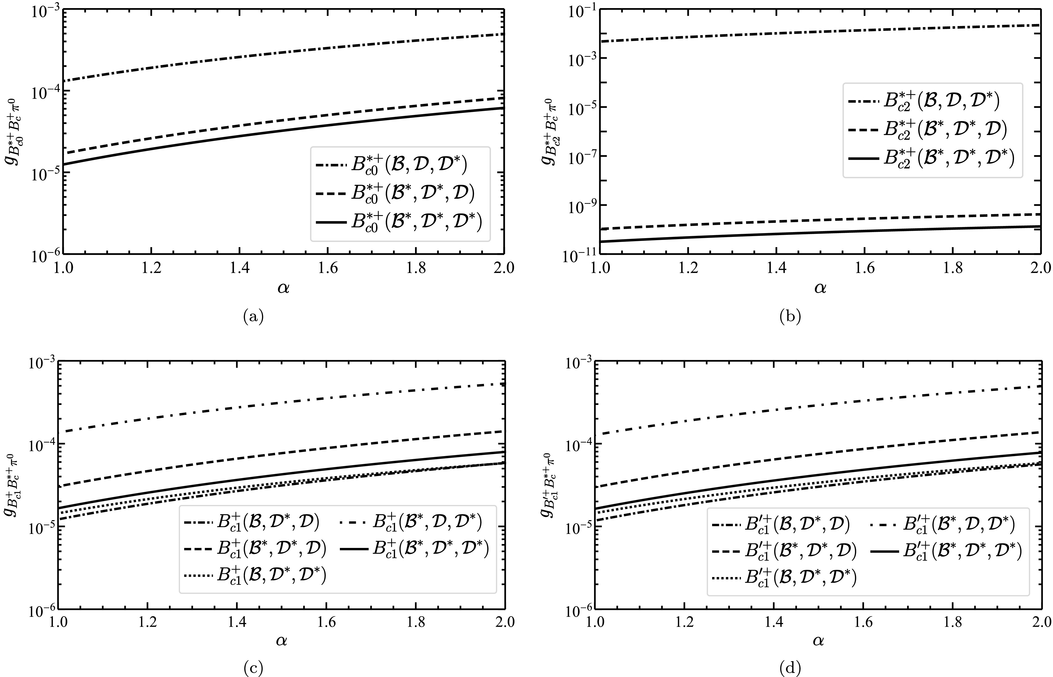 $ B_{cJ} $ couplings to$ \mathcal{B}^{(*)}\mathcal{D}^{(*)} $ are as follows [45, 46]:$ \begin{aligned}[b] \mathcal{L}_{B_{c}}=\;&ig_{B_{c}\mathcal{B}^{*}\mathcal{D}}B_{c}\mathcal{B}^{*i}_{\mu}\partial^\mu \mathcal{D}_{i}+ig_{B_{c}\mathcal{B}\mathcal{D}^{*}}B_{c}\partial^\mu\mathcal{B}_{i} \mathcal{D}^{*i}_{\mu}\\&+g_{B_{c}\mathcal{B}^{*}\mathcal{D}^{*}}\varepsilon_{\mu\nu \rho\sigma}B_{c}\partial^{\mu}\mathcal{B}^{*i\nu}\partial^{\rho}\mathcal{D}^{*\sigma}_{i}+h.c.\,, \end{aligned} $