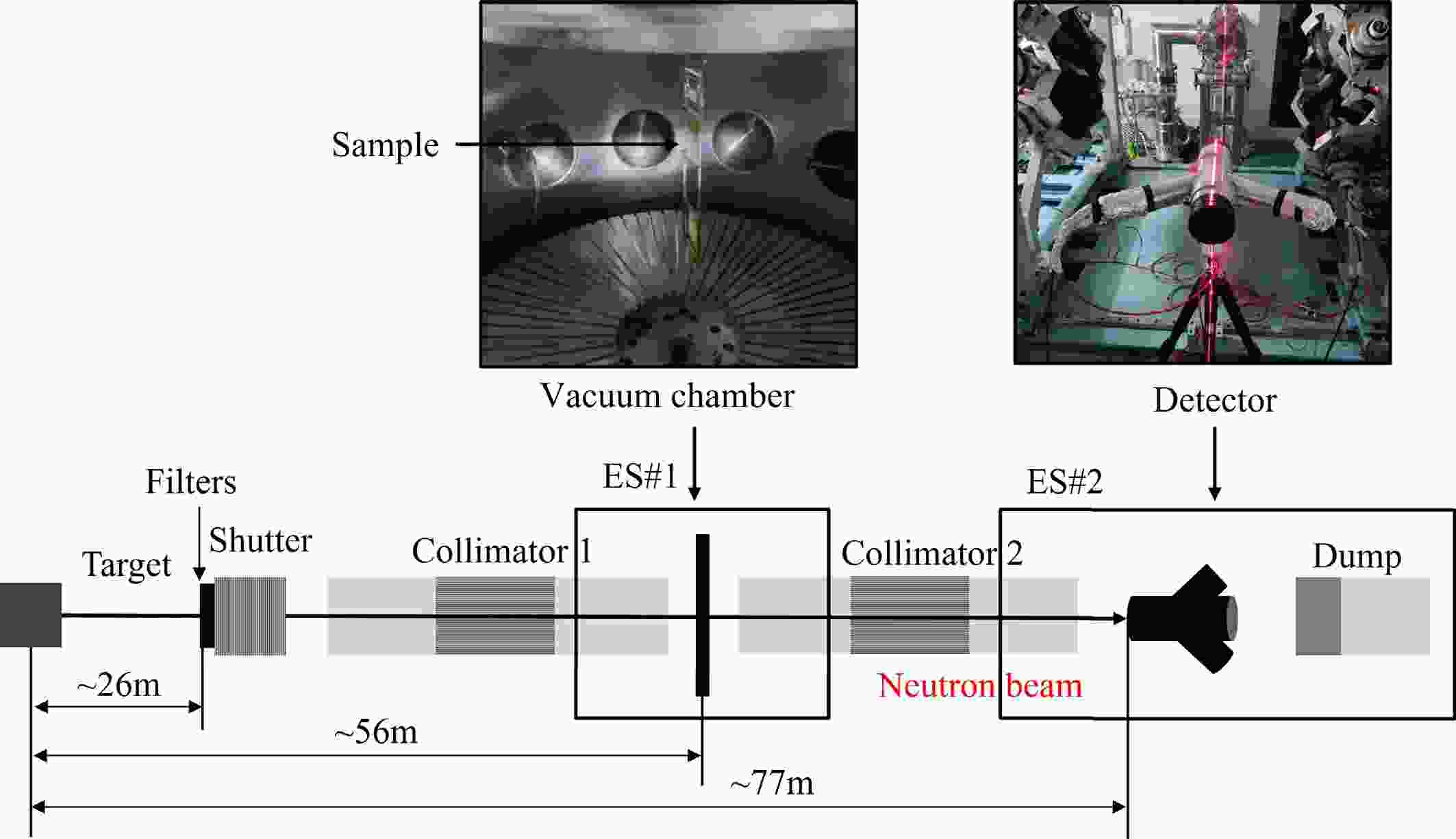 At the CSNS Back-n facility, the neutrons are produced by 1.6 GeV/c proton beam striking a tungsten target. The beam operated in a double-bunch mode at 25 Hz, with each pulse containing two 42-ns-wide bunches separated by 410 ns. The experimental layout is shown in Fig. 2. There are two experimental stations: Experimental Station 1 (ES#1) and Experimental Station 2 (ES#2) at the Back-n. Three collimators located at 24 m, 50 m and 70 m from the spallation target are utilized to adjust the shape of neutron beam spot. The first collimator is a beam shutter and equipped with filters. For the neutron total cross section measurements, the inner diameters of the three collimators are 3 mm, 15 mm, and 40 mm, producing a neutron beam spot with a diameter of 3 mm at ES#2. The detector surface was approximately 21 m from the sample center, while the sample center was about 56 m from the spallation target center. This configuration can reduce the background of scattered neutrons.