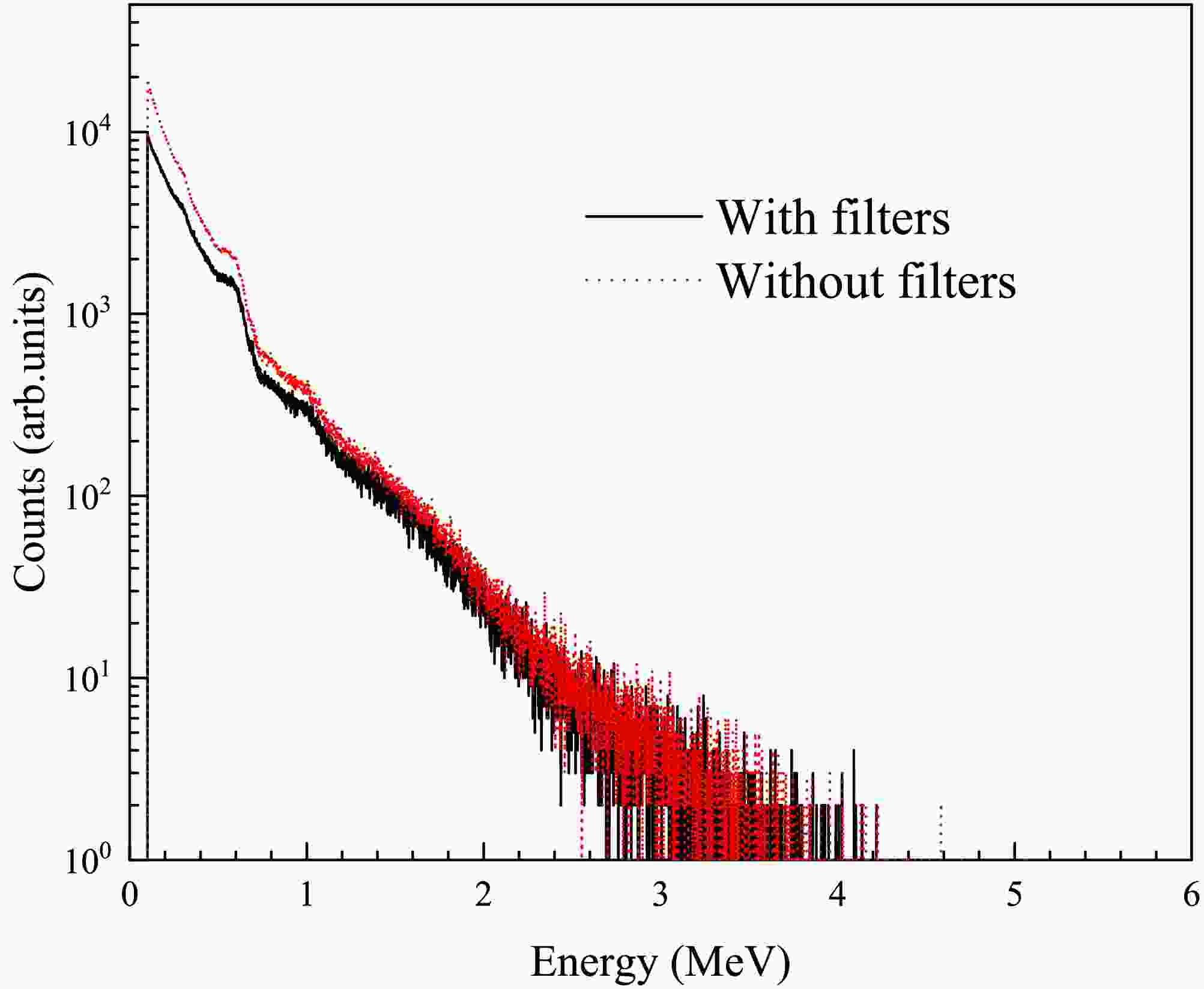 $ B_{\text{Li6out}} $ is the total background of the 6Li-GS detector without sample or filters.$ B_{0\text{Li6out}} $ is the flat background of the 6Li-GS detector.$ C_{\text{Li7out}} $ is the measured counts of the 7Li-GS, and$ B_{0\text{Li7out}} $ represents the flat background of the 7Li-GS detector.$ k_f $ is the normalization factor for in-beam γ ray, determined to be 0.42 from Eq. (7), similarly. As shown in Fig. 8, the top panel shows the background composition of the 6Li-GS detector with filters. The background curve passes through the obvious resonance peaks of 181Ta (4.28 eV) and 59Co (132 eV). And$ k_a $ is the attenuation factor of the in-beam γ-ray due to the filters. To determine the attenuation factor$ k_a $ , the in-beam γ-ray spectra with and without the filters were simulated using the Geant4 toolkit (version 10.7.4) [26–28]. As shown in Fig. 9, it shows the simulated γ-ray energy spectra measured by the 7Li-GS detector. Since the energy distribution of in-beam γ-ray remains invariant over different neutron flight time intervals [23],$ k_a $ is determined to be 0.91 [29]. The deviation between$ k_f / k_a $ and$ k_{\text{in}} $ is within 5%, indicating the accuracy of the simulation and validating the reliability of the background estimation based on Eq. (8). -