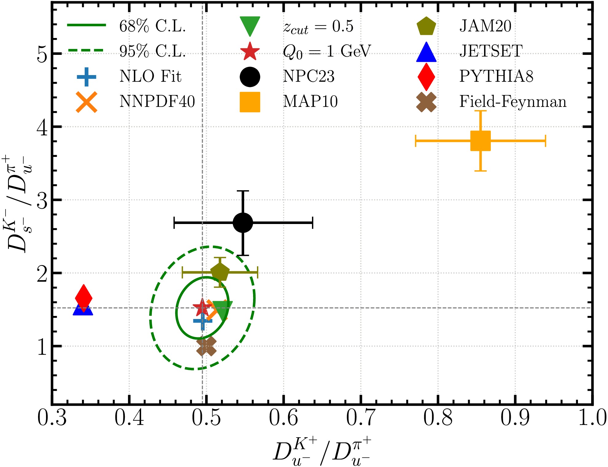 $ D_{u^-}^{K^+}/D_{u^-}^{\pi^+} $ and$ D_{s^-}^{K^-}/D_{u^-}^{\pi^+} $ . Our best-fit predicts these ratios to be 0.49 and 1.52, respectively. The two ellipses represent the 68% and 95% C.L. region determined with the Hessian method. A tolerance of$ \Delta \chi^2=5.4 $ is estimated for our nominal joint fit due to the slightly worse agreement with the COMPASS proton data. We show predictions from alternative fits with NNPDF4.0 PDFs, a z cut of 0.5, and$ Q_0=1 $ GeV, and a NLO fit. They all fall within the 68% C.L. error ellipse of the NNLO nominal fit. The Field-Feynman model predicts the two ratios to be 0.50 and 1.0, which is close to the boundary of the 68% C.L. error ellipse. We also calculate the ratios using either NNLO and NLO FFs from global analyses or MC simulations following similar procedure as explained in the pion-only fit. In the calculations we have integrated the FFs over z from 0.4 to 1 before taking the ratios. The central prediction from NPC23 (JAM20) FFs is close to the boundary of the 95% (68%) C.L. error ellipse while that from MAP10 shows much larger values of the two ratios. Both PYTHIA8 and JETSET [78] predict a stronger strangeness suppression with$ D_{u^-}^{K^+}/D_{u^-}^{\pi^+} $ of about 0.34.