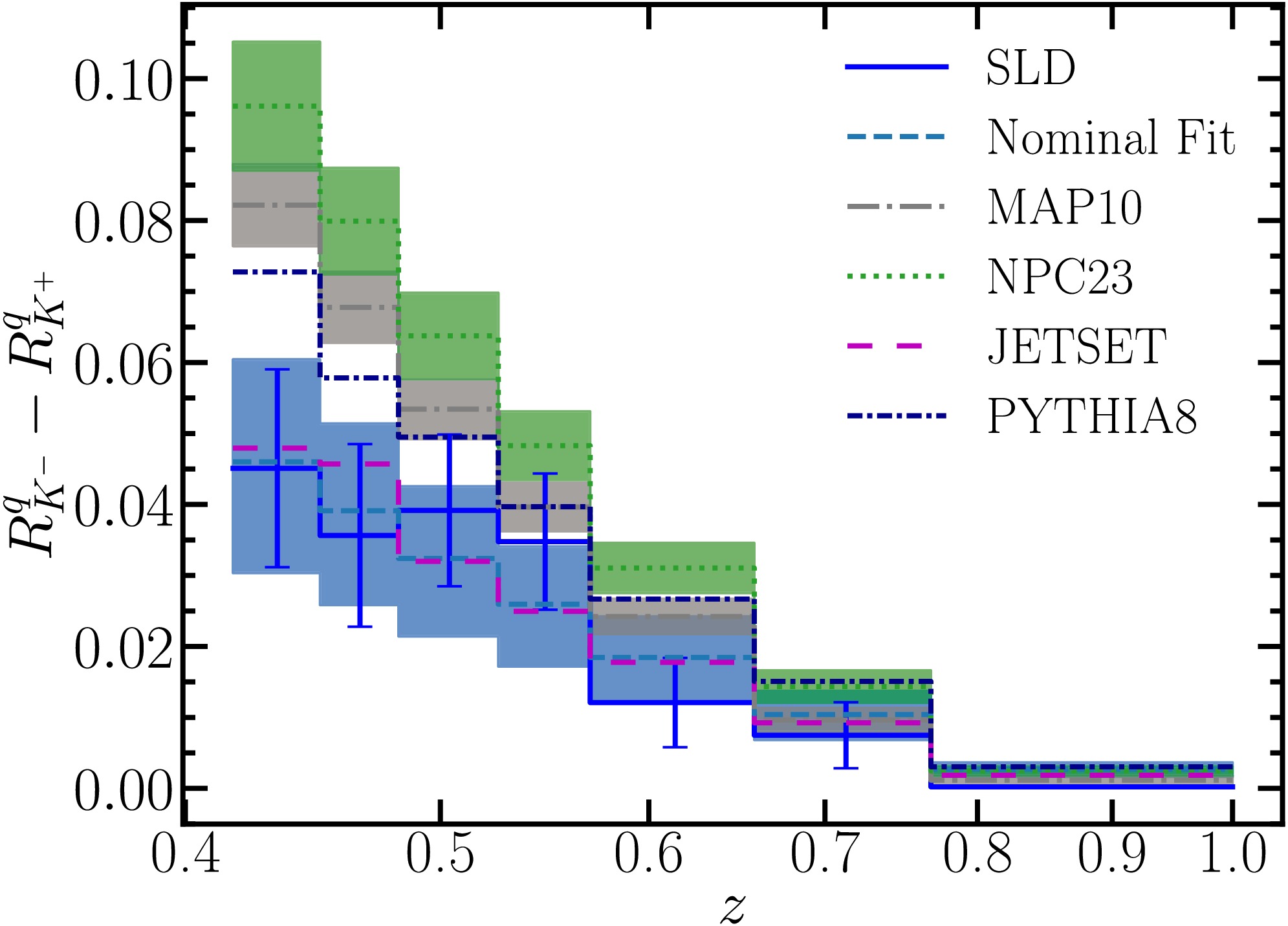 $ R^q_{K^-}-R^q_{K^+} $ , where R denotes the measured hadron multiplicities. We compare our NNLO predictions from the joint fit, including Hessian uncertainties, to the SLD data, which are shown with error bars. They agree well within the large uncertainties on both sides. Predictions from the JETSET simulation also agree well with the SLD data, due to its generally lower hadron multiplicities. Predictions from the PYTHIA8 simulation, as well as NNLO predictions using NPC23 and MAP10 FFs, are well above the SLD measurements. -