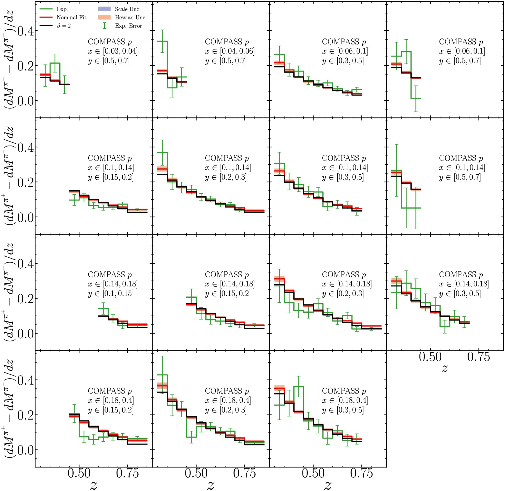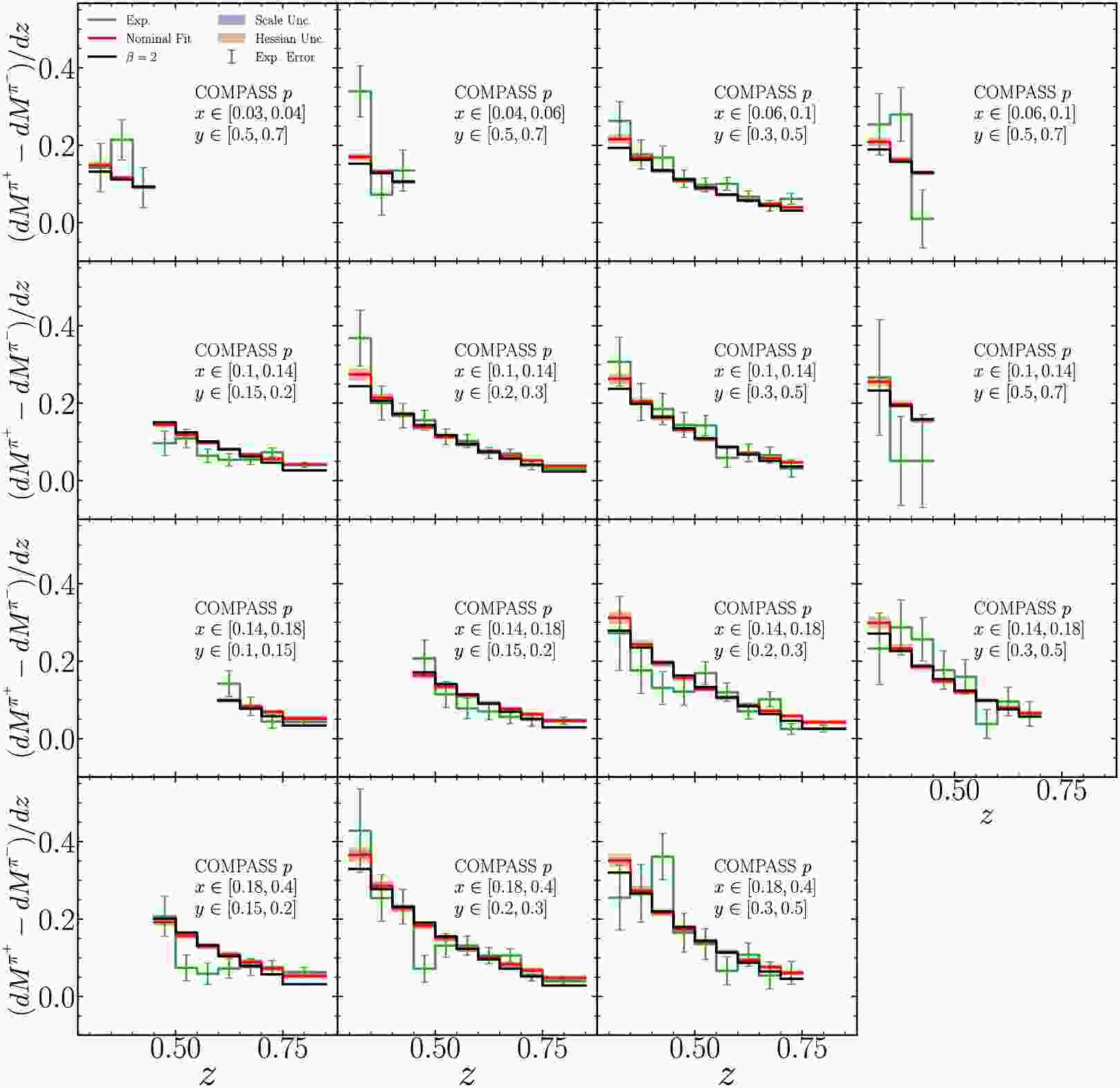 $ \beta=2 $ for COMPASS measurements of pion multiplicity difference with iso-scalar target. Scale uncertainties are shown in shaded bands and estimated by varying$ \mu_R/{\mu_{R,0}}=\mu_F/{\mu_{F,0}}=\mu_D/\mu_{D,0}= $ $ \{1/2,1,2\} $ and taking the envelope. Hessian uncertainties are evaluated by the Hessian method. Experimental uncertainties shown are quadratic sum of statistical and uncorrelated systematic uncertainties. Each panel represents different kinematic regions in x and y.
