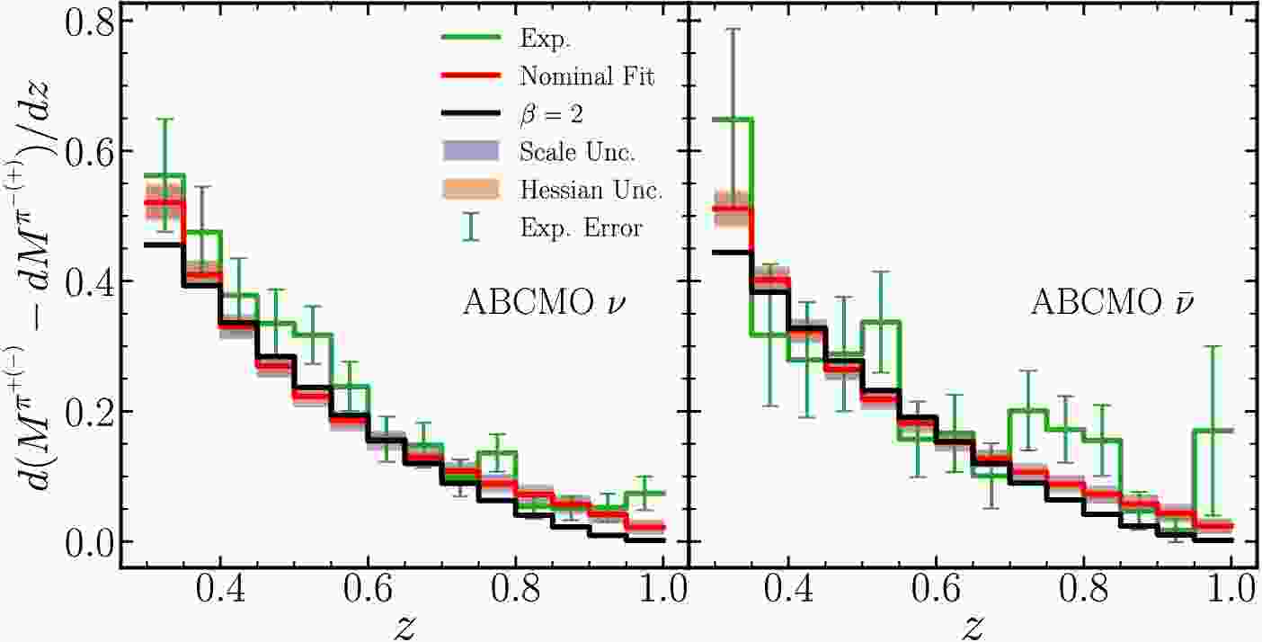 $ N_{pt} $ ,$ \chi^2 $ ,$ \chi^2/N_{pt} $ , and the effective Gaussian variable$ S_E $ . Note in estimation of the Hessian uncertainties, we use a$ \Delta\chi^2 $ tolerance being square of the maximal effective Gaussian variables of all individual data sets [27]. For the pion-only fit, we also compare to the alternative fit fixing$ \beta = 2 $ .pion ( $ z>0.3 $ )$ N_{\rm{pt}} $ nominal fit fixing $ \beta=2 $ $ \chi^2 $ $ {\chi^2}/{N_{\rm{pt}}} $ $ S_E $ $ \chi^2 $ $ {\chi^2}/{N_{\rm{pt}}} $ $ S_E $ HERMES (p) 6 2.5 0.42 -1.11 12.6 2.10 1.64 HERMES (D) 6 6.7 1.12 0.38 4.4 0.74 -0.30 COMPASS (p) 102 124.3 1.22 1.51 147.0 1.44 2.82 COMPASS (iso.) 107 87.8 0.82 -1.35 122.8 1.15 1.08 ABCMO (ν) 14 15.3 1.09 0.37 21.6 1.54 1.36 ABCMO ( $ \bar \nu $ )14 15.7 1.12 0.43 17.9 1.28 0.80 Total 249 252.4 1.01 0.18 326.4 1.31 3.19 Table A1. Quality of the pion-only fits. Results are shown for both the nominal fit and the constrained fit with