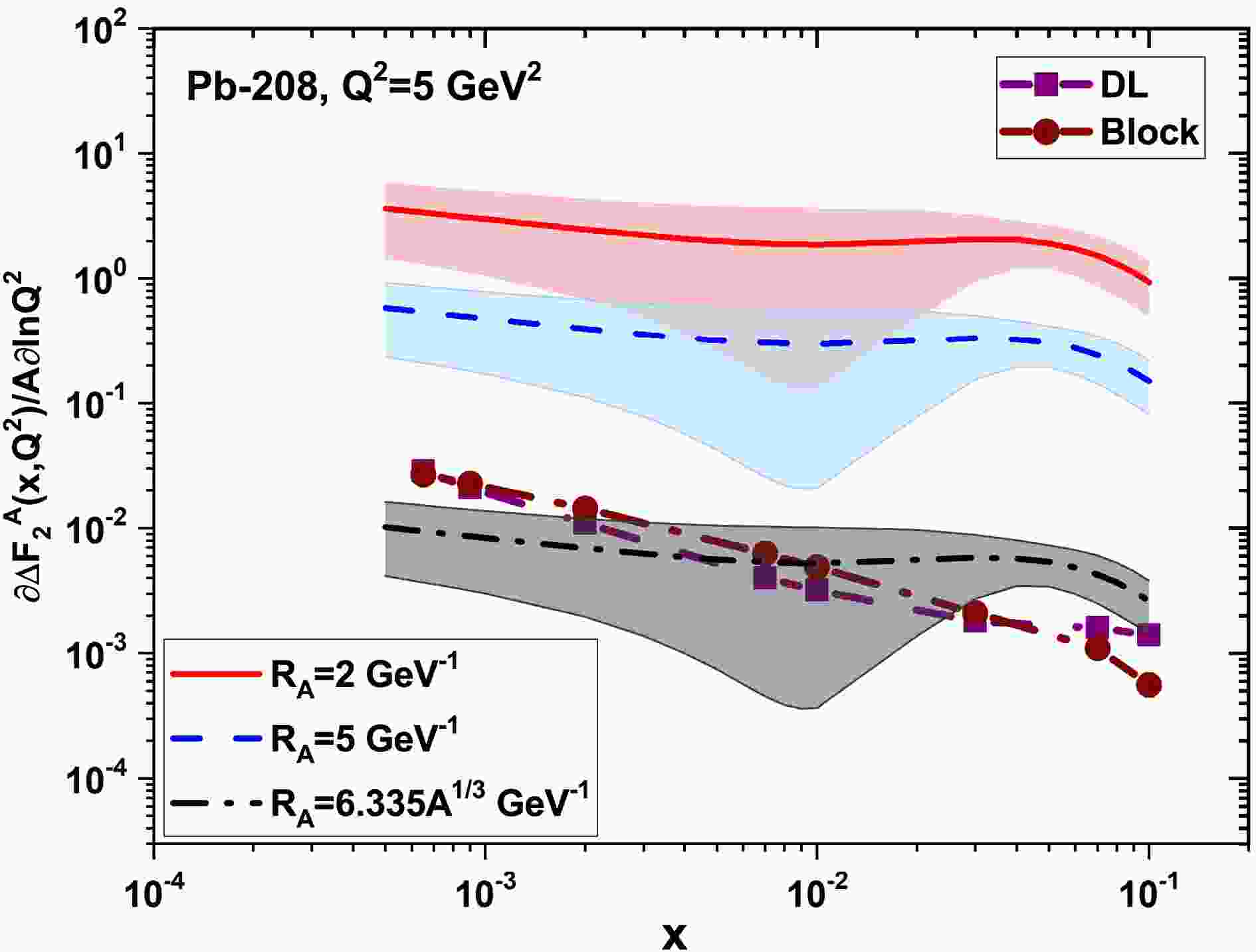 $ \frac{1}{A}\frac{\partial}{\partial{\ln}Q^2}{\Delta}F_{2}^{A}(x,Q^2) $ , which quantifies the effect of non-linear corrections. In Fig.1, the non-linear corrections to$ \frac{1}{A}\frac{\partial}{\partial{\ln}Q^2}{\Delta}F_{2}^{A}(x,Q^2) $ for the heavy nucleus of Pb-208 are plotted as a function of the momentum fraction x at$ Q^2=5\; {\rm{GeV}}^2 $ and$ {\cal{R}}_{A}=1.25A^{1/3}\; {\rm{fm}} $ (or$ {\cal{R}}_{A}=6.335A^{1/3}\; {\rm{GeV}}^{-1} $ )). The results are determined with respect to the DL (square-purple) [32] and Block et al (circle-brown) [33, 34] methods. They are also compared to the nCTEQ15 parameterization with uncertainties at corresponding values of$ Q^2 $ represented by the solid curve (red,$ {\cal{R}}_{A}=2\; {\rm{GeV}}^{-1} $ ), the dashed curve (blue,$ {\cal{R}}_{A}=5\; {\rm{GeV}}^{-1} $ ) and the dashed-dot curve (black,$ {\cal{R}}_{A}=1.25A^{1/3}\; {\rm{fm}} $ . These results are comparable to the nCTEQ15 parameterization at$ {\cal{R}}_{A}=1.25A^{1/3}\; {\rm{fm}} $ . The nCTEQ15 parameterization results in a wide range of x are flat, while our results increase as x decreases. This difference is due to the behavior of the DL and Block et al gluon distribution functions. With an increase in$ Q^2 $ values, the nCTEQ15 parameterization results increase as x decreases. In Fig.2, we show this behavior for the heavy nucleus of Pb-208 at$ Q^2=10\; {\rm{GeV}}^2 $ . Our results are comparable to the nCTEQ15 parameterization results accompanied by uncertainties at small x values. The difference between the results with the nCTEQ15 parameterization results at$ {\cal{R}}_{A}=1.25A^{1/3}\; {\rm{fm}} $ at moderate x values is due to the gluon dominance solely in our results. In Figs.1 and 2, we observe that the non-linear corrections to the derivative of the nuclear structure function (i.e., Eq.(16)) decrease with increasing correlation radius$ {\cal{R}}_{A} $ of the gluon hot spots (Indeed, the non-linear terms in the GLR-MQ equations are suppressed as$ 1/{\cal{R}}^{2}_{A} $ ). The x and$ Q^2 $ dependence in these figures (i.e., Figs.1 and 2) is also influenced by the behavior of the gluon distribution function in Eq.(16). As expected, the recombination of low-x gluons can be seen as a consequence of gluon-gluon recombination in Eq.(16) as$ [xg(x,Q^2)]^2 $ .In the following, we present the non-linear corrections to the derivative of the nuclear reduced cross section into