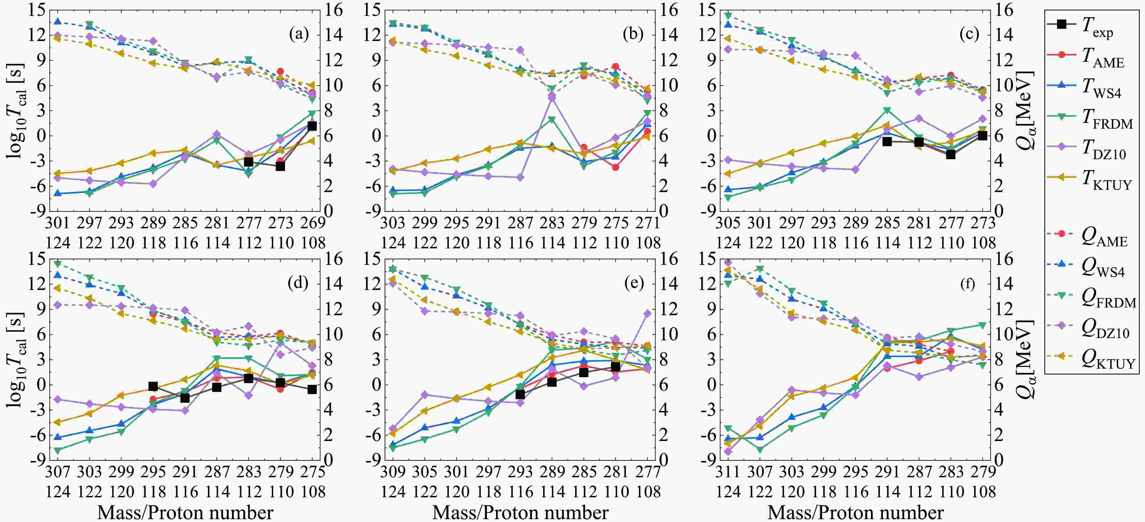 $ Q_{\alpha} $ and the solid lines represent the corresponding decay half-lives$ T_{1/2} $ . The black lines represent the available experimental α-decay half-lives given in AME2020 with known α-decay branch ratios, while the colored lines correspond to the theoretical calculations where the decay energies and preformation factors are both deduced from the nuclear masses. Besides, all panels are plotted from large mass and proton numbers to small ones, demonstrating the possible α-decay chains. Generally, the theoretical α-decay energies in all figures decrease with the decreasing mass and proton numbers, while the tendency for the theoretical decay half-lives is inverse. This is because the larger decay energy will enhance the probability of α-cluster penetrating the potential barrier, leading to smaller decay half-life. Besides, from Figs. 3-6 we can also see that among all models, the WS4 and FRDM masses provide the most consistent half-life predictions with the AME2020 data, while the DZ10 exhibits systematic fluctuations in the superheavy region. The higher accuracy of the former two mass models originates from their refined macroscopic–microscopic frameworks, which include updated shell and deformation corrections optimized for heavy nuclei. In contrast, while successful in medium-mass regions, the DZ10 model tends to estimate the nuclear masses in the superheavy domain with large uncertainty, resulting in larger deviations in decay energies and half-life predictions. The detailed numerical values for the experimental α-decay half-lives and those calculated with the DDCM using AME2020, WS4, FRDM, DZ10, and KTUY nuclear masses are listed in Table 2 for the known nuclei in Figs. 3-6. It is shown that the theoretical calculations generally agree with the experimental data, especially the AME2020 results with a smallest RMSE of 0.8. Besides, the results with WS4 masses are more consistent with the experimental data than those with FRDM, DZ10 and KTUY masses.