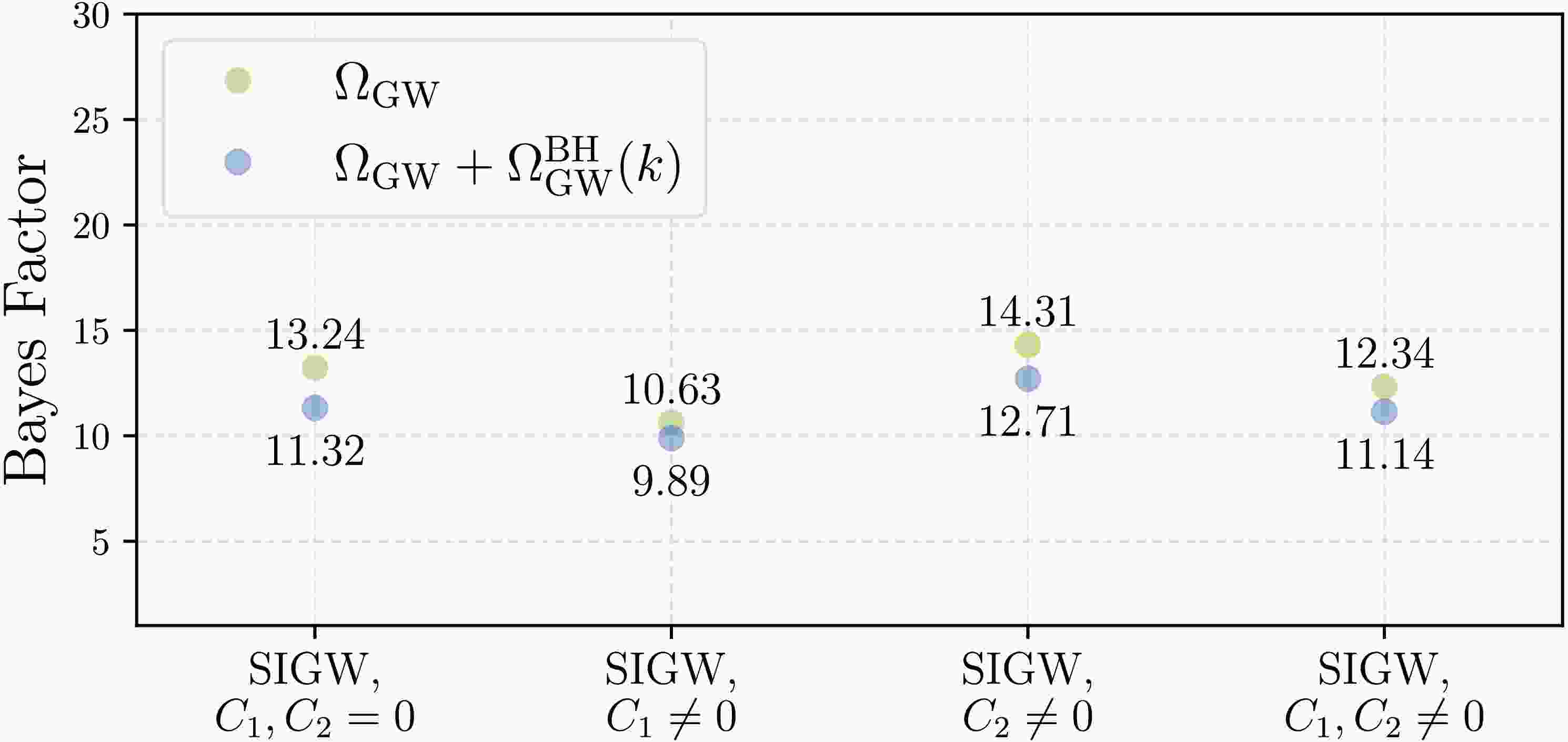 Figure 10. (color online) The Bayes factors between different models. The vertical axis represents the Bayes factor of different models relative to SMBHB, and the horizontal axis represents the different models. The green dots are for models without SMBHB and the blue dots are for models in combination with the SMBHB signal.