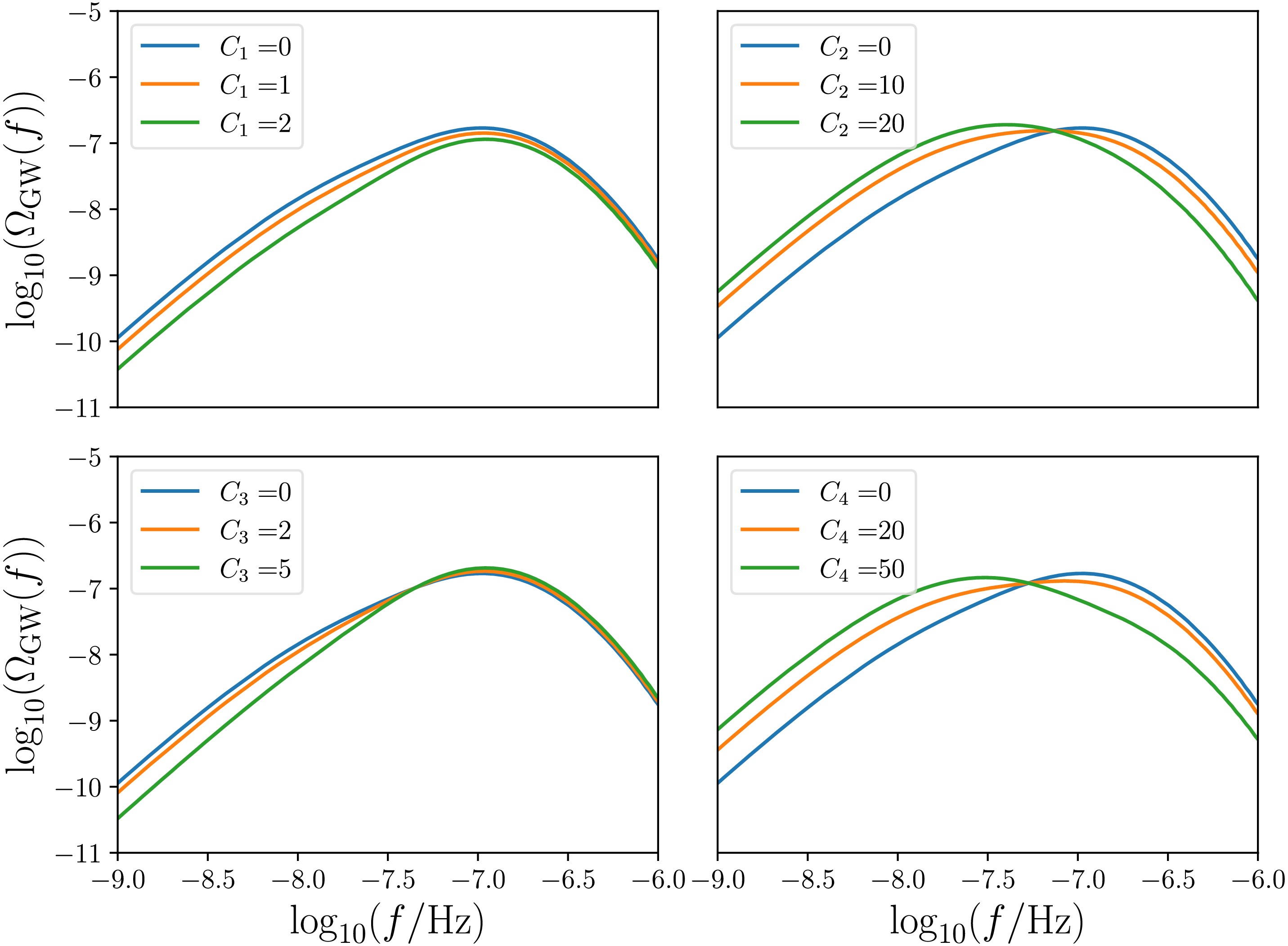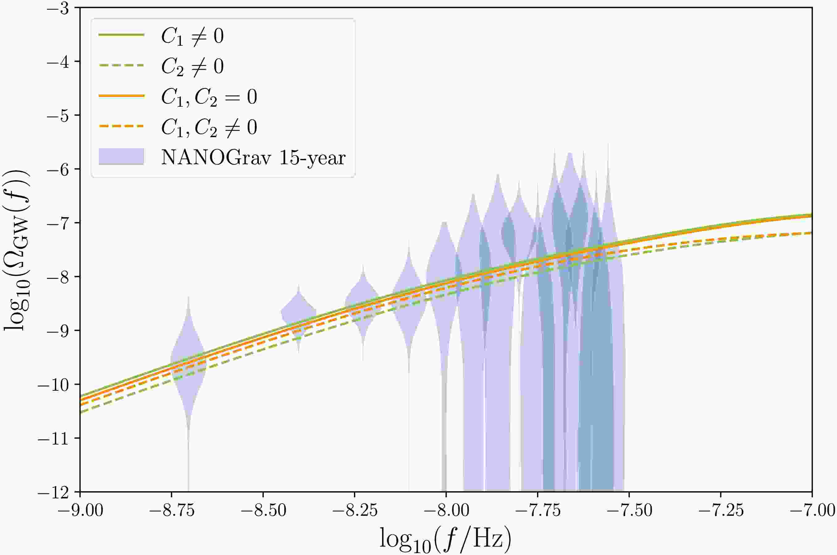 $ C_2\ne 0 $ and$ C_1\ne 0 $ , respectively. In the rest of this section, we will discuss the impact of these two models on PTA and LISA observations separately, and consider model-independent scenarios where both$ C_1 $ and$ C_2 $ are non-zero. -