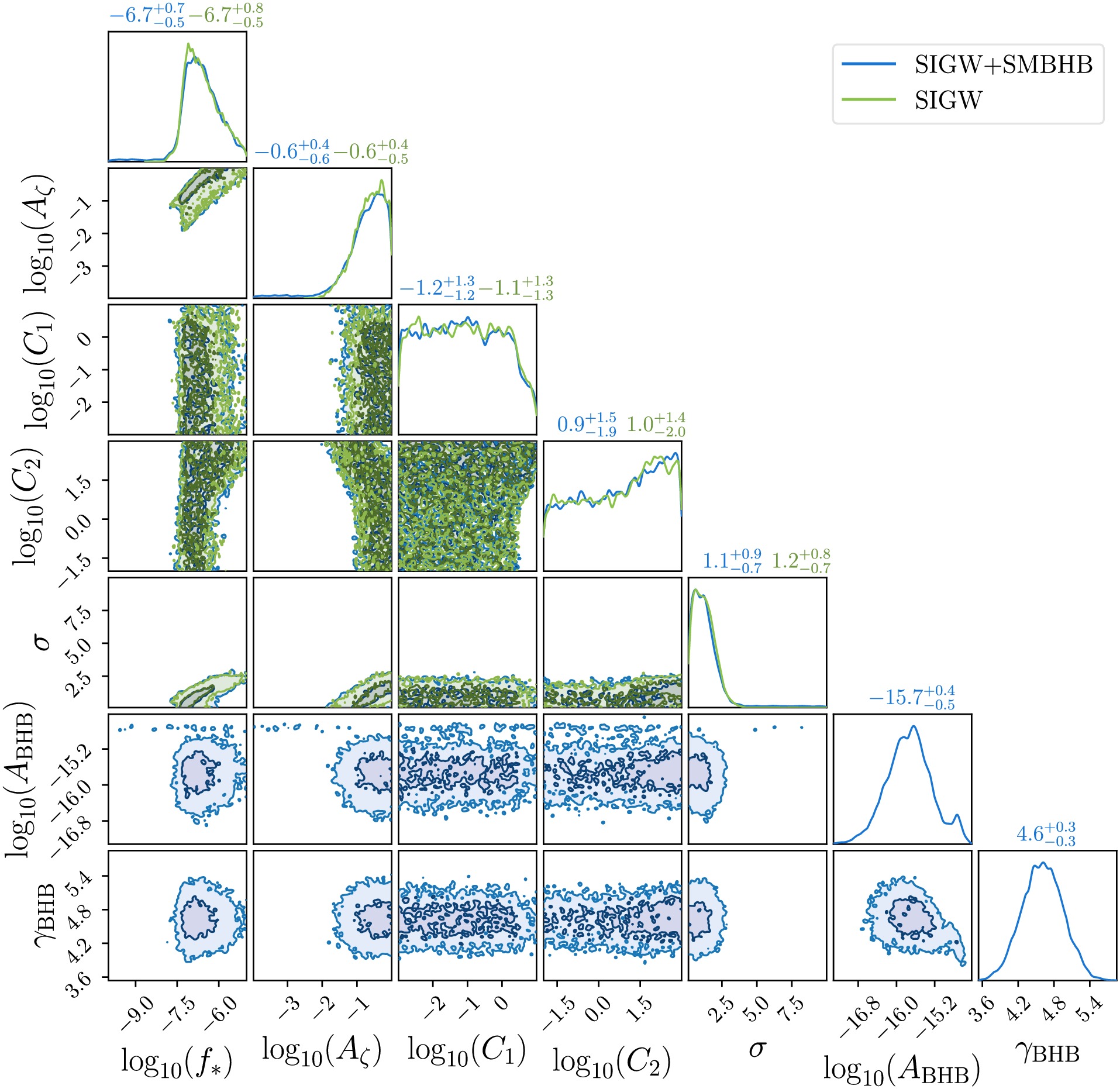 $ C_1 \neq 0 $ . The blue and green curves correspond to the NANOGrav 15-year dataset. Off-diagonal panels display 1-σ and 2-σ confidence intervals for joint distributions, while diagonal panels provide marginal distributions with median values and 1-σ uncertainties noted above each histogram.