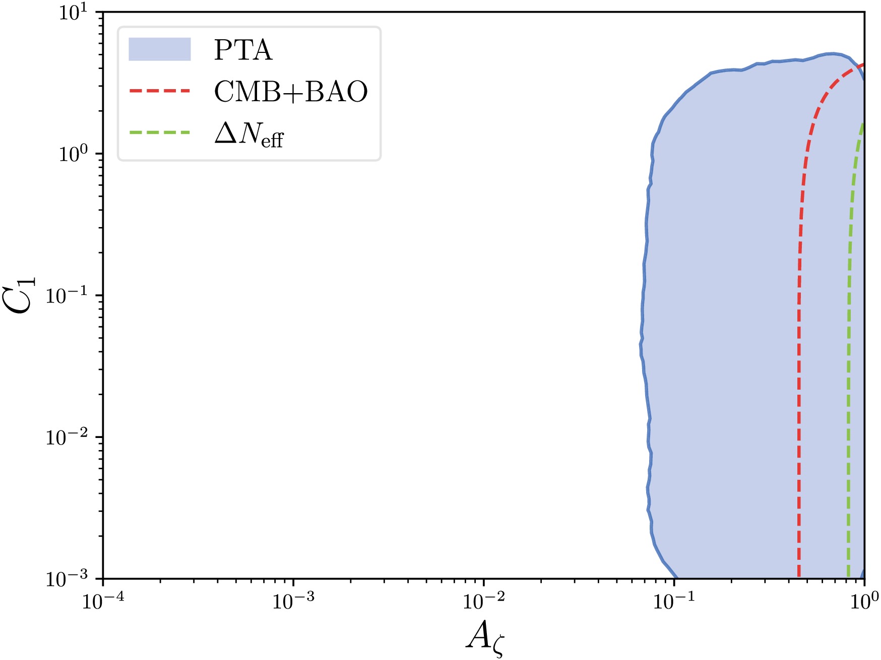 $ A_\zeta $ and$ C_1 $ assuming$ \sigma=1 $ and$ C_2=0 $ . The blue shaded region represents the 95% credible intervals corresponding to the two-dimensional posterior distribution shown in Fig. 3 with the KDE method. The red and green lines denote the lower bounds of$ C_1 $ from CMB and BAO observations in Eq. (42) and$ \Delta N_{\mathrm{eff}} $ in Eq. (41).