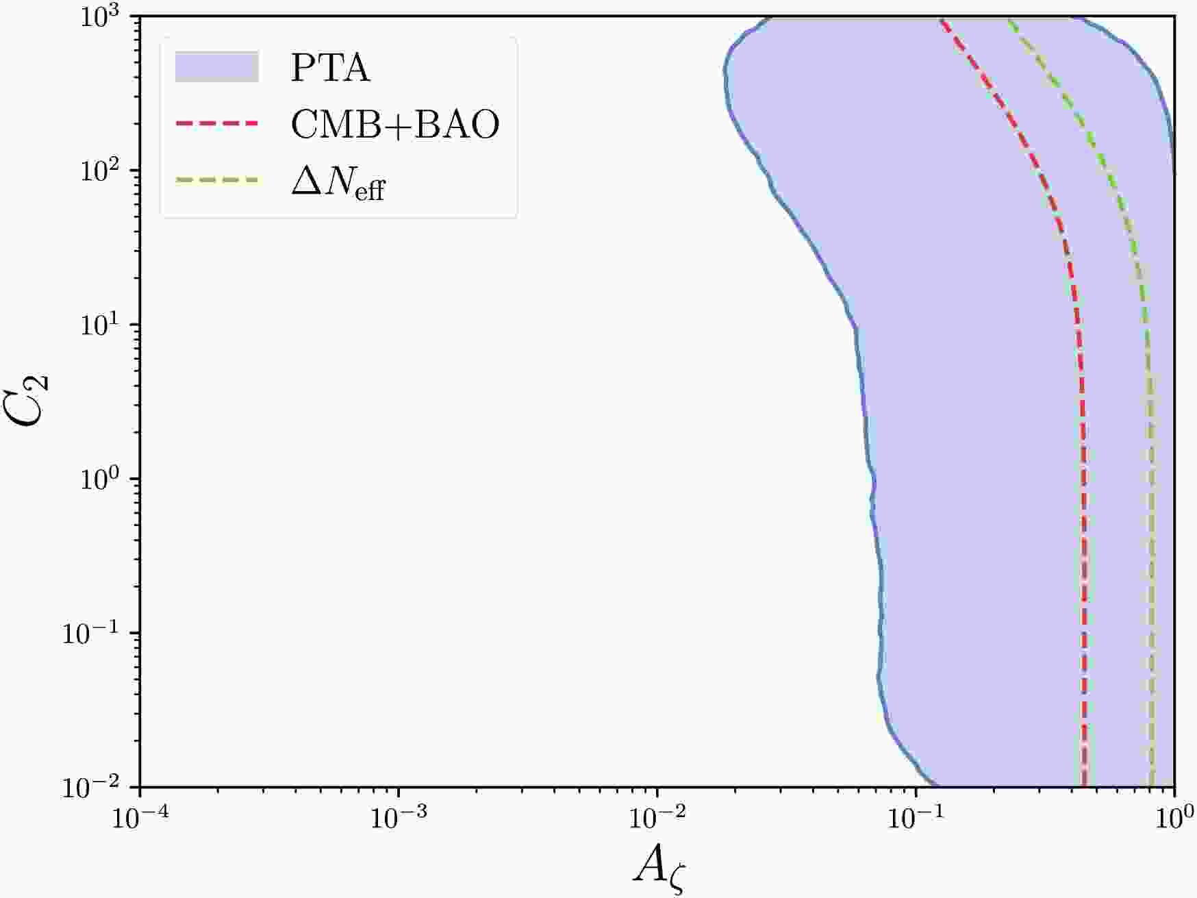 $ A_\zeta $ and$ C_2 $ assuming$ \sigma=1 $ and$ C_1=0 $ . The blue shaded region represents the 95% credible intervals corresponding to the two-dimensional posterior distribution shown in Fig. 4 with the KDE method. The red and green lines denote the upper bounds of$ C_2 $ from CMB and BAO observations in Eq. (42) and$ \Delta N_{\mathrm{eff}} $ in Eq. (41).
