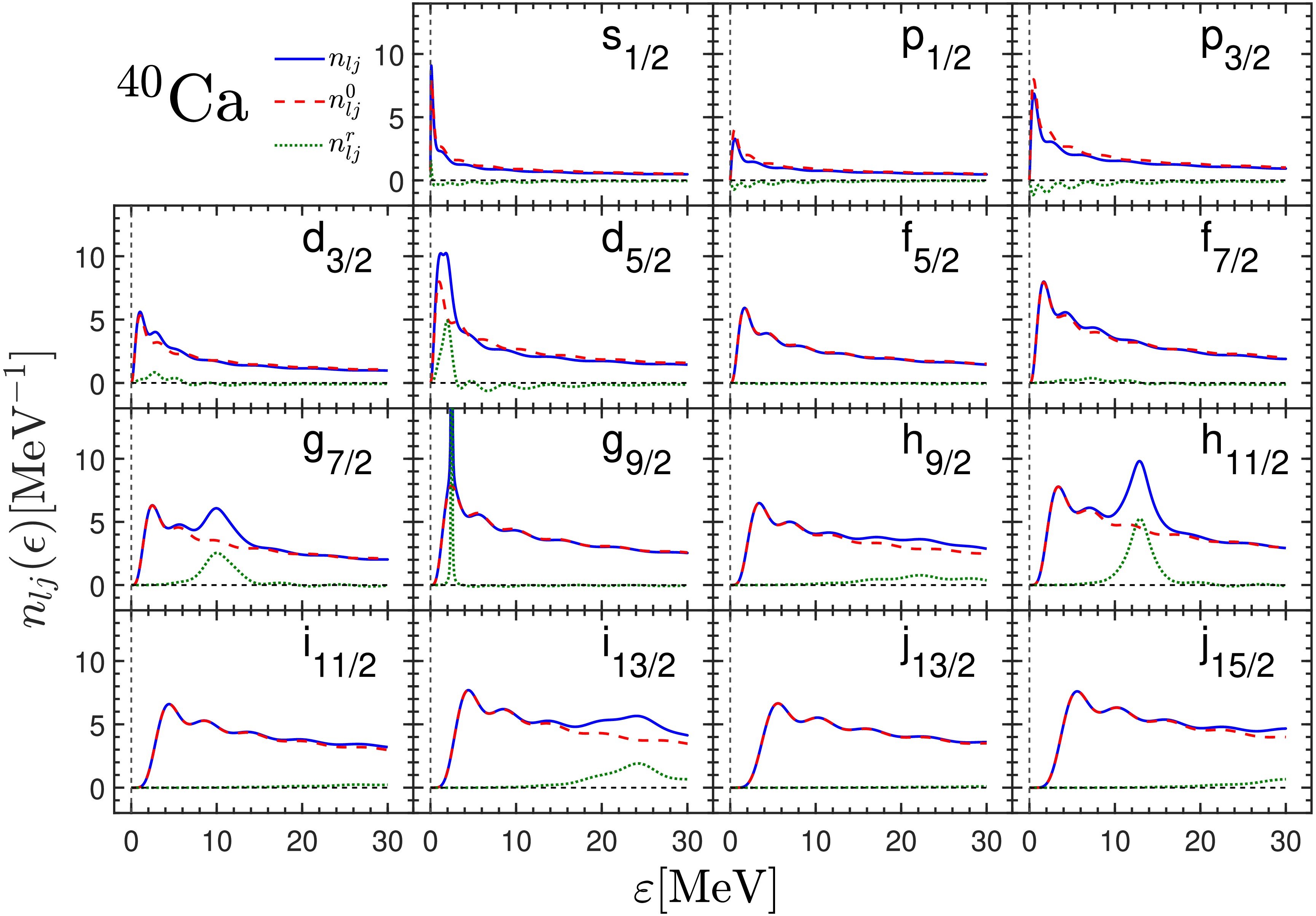$ n_{lj}(\epsilon) $ ($ \epsilon=\varepsilon+\mathrm{i}\kappa $ with$ \kappa=1 \times 10^{-3}\ \mathrm{MeV} $ ) for different angular momentum partial waves in$ { }^{40} \mathrm{Ca} $ calculated by GF method with Woods-Saxon type mean-field and its spin-orbit potentials (solid line), with only centrifugal barrier$ n^0_{lj}(\epsilon) $ (dashed line) and their differences$ n^r_{lj}(\epsilon)=n_{lj}(\epsilon)-n^0_{lj}(\epsilon) $ (dotted line) in the box$ R_{\rm box}=20 $ fm. The dashed vertical line at$\varepsilon = 0$ marks the continuum threshold.$ \mathrm{FWHM}=2\left(\kappa+\frac{\Gamma}{2}\right). $