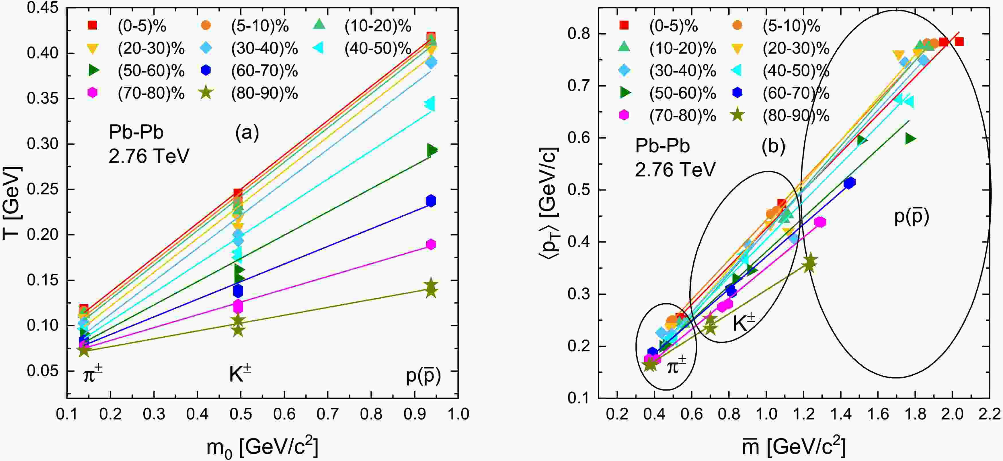 $ m_0 $ and (b)$ \langle p_T\rangle $ versus mean moving mass$ \overline{m} $ for light flavoured particles produced in Pb-Pb collisions at$ \sqrt{s_{NN}} $ = 2.76 TeV. The solid lines are the linear fitting results.Collision Energy Particles Types Centrality Bins Intercept ( $ \langle T_0\rangle $ [GeV])Slope $ \chi^2 $ Pb—Pb 2.76 TeV 0-5 % 0.0617 $ \pm $ 0.00310.3771 $ \pm $ 0.00890.0070 5-10 % 0.0617 $ \pm $ 0.00450.3771 $ \pm $ 0.01490.0119 10-20 % 0.0617 $ \pm $ 0.00400.3771 $ \pm $ 0.01290.0103 20-30 % 0.0617 $ \pm $ 0.00250.3771 $ \pm $ 0.00890.1100 $ \pi^{\pm} $ ,$ K^{\pm} $ ,$ p(\bar{p}) $ 30-40 % 0.0501 $ \pm $ 0.00810.3608 $ \pm $ 0.02790.0223 40-50 % 0.0455 $ \pm $ 0.00700.3126 $ \pm $ 0.20700.0166 50-60 % 0.0436 $ \pm $ 0.00600.2562 $ \pm $ 0.01750.0140 60-70 % 0.0404 $ \pm $ 0.00310.1940 $ \pm $ 0.01010.0081 70-80 % 0.0372 $ \pm $ 0.00160.1408 $ \pm $ 0.00500.0040 80-90% 0.0352 $ \pm $ 0.00710.0745 $ \pm $ 0.01730.0138 Table 2. The values of y-intercept and slope extracted from the linear fit of the T versus
